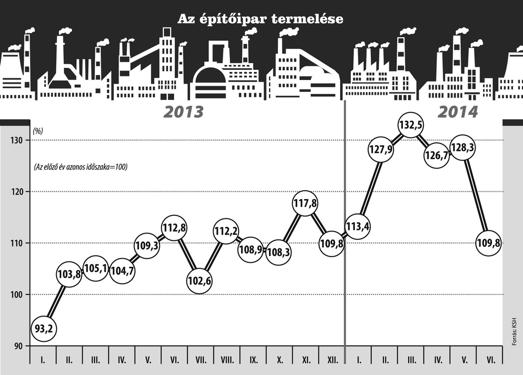 Az építőipar termelése ugyan 9,8 százalékkal volt magasabb júniusban, mint 12 hónappal korábban, de hetedével kevesebb új szerződést kötöttek - ez derül ki a Központi Statisztikai Hivatal (KSH) szerdán kiadott jelentéséből. A növekedés továbbra sem a magánerős, hanem elsősorban az uniós forrásokból megvalóuló, az állami infrastrukturális beruházásoknak volt köszönhető. Az ÉVOSZ szerint újabb fellendülés ugyancsak az uniós forrásoktól várható.