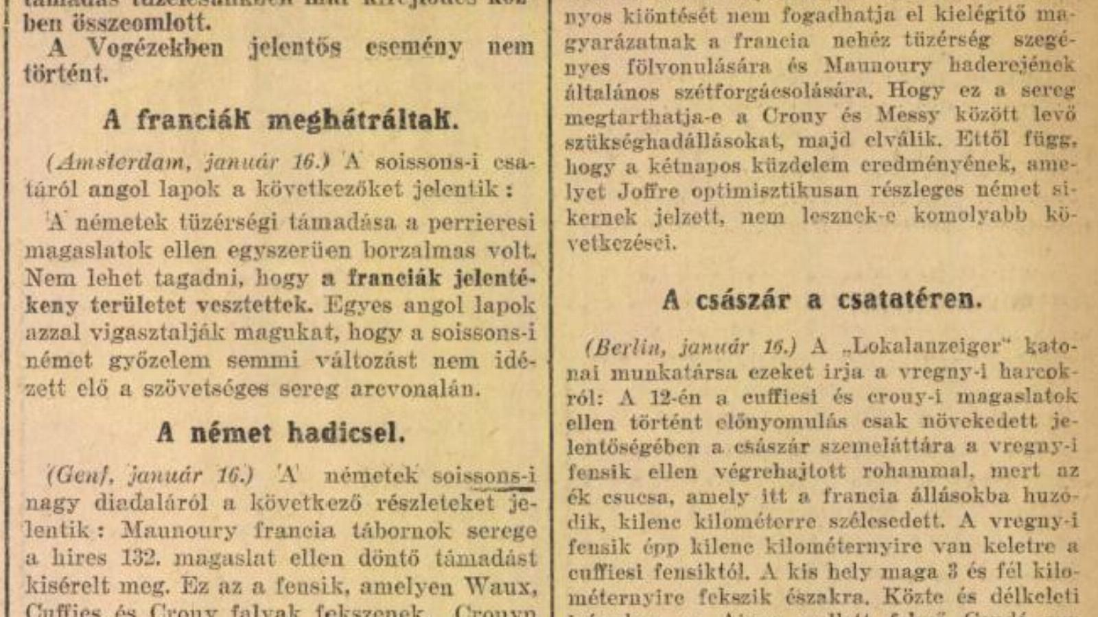 (Genf, január 16.) Maunoury tábornok állása soinssonsi balsikere után megrendült. Joffre jelentése az ottani elite csapatok helyzetét fölötte enyhén itéli meg ugyan, ám a katonai kritika az Aisne folyónak mindkét félre hátrányos kiöntését nem fogadhatja el kielégítő magyarázatnak a francia nehéz tüzérség szegényes fölvonulására és Maunoury haderejének általános szétforgácsolására. Hogy ez a sereg megtarthatja-e a Crouy és Messy között levő szükséghadállásokat, majd elválik. Ettől függ, hogy a kétnapos küzdelem eredményének, amelyet Joffre optimisztikusan részleges német sikernek jelzett, nem lesznek-e komolyabb következései.