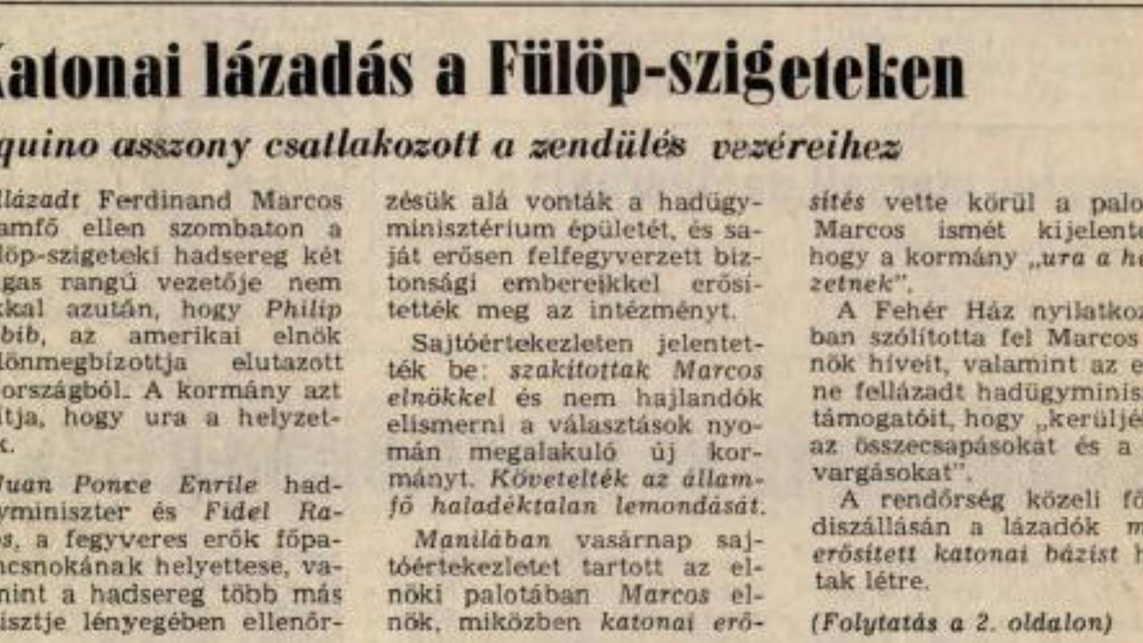 Fellázadt Ferdinand Marcos államfő ellen szombaton a Fülöp-szigeteki hadsereg két magas rangú vezetője nem sokkal azután, hogy Philip Habib, az amerikai elnök különmegbízottja elutazott az országból. A kormány azt állítja, hogy ura a helyzetnek.