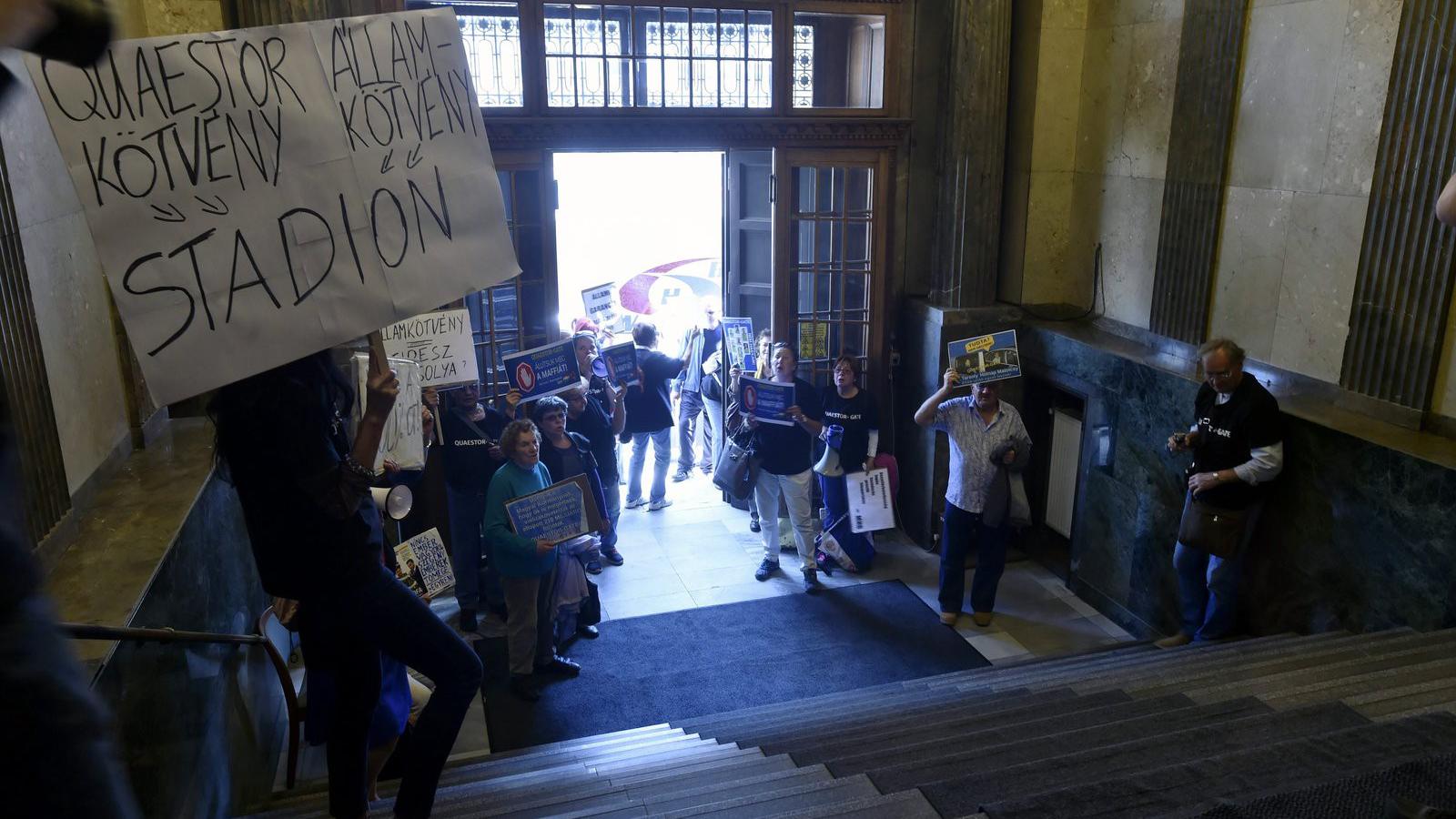 Az eseményt emiatt áttették a Nemzetgazdasági Minisztériumba. De a demonstrálók oda is követték őket. Varga Mihály egyébként arról adott tájékoztatás, hogy az Államadósság Kezelő Központ 50 milliárd forint értékben fix, évi 2,5 százalékos kamattal kétéves lejáratú állampapírt bocsát ki. Az állampapír a legstabilabb, legbiztonságosabb befektetési forma, "ha a tüntetők annak idején ilyet vásároltak volna, most nem lennének itt" - reagált Varga a szerinte rossz helyre szervezett tüntetésre.