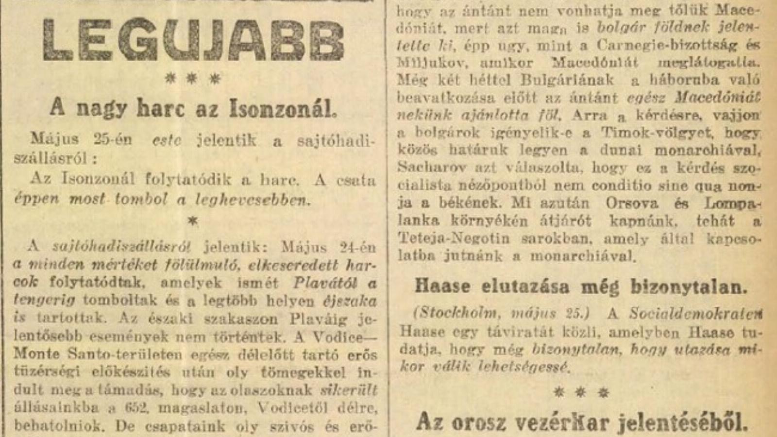 A görzi szakaszon a harci tevékenység csak tüzérségi harcokra szorítkozott. A gyalogság nem lépett akcióba. A küzdelem gócpontja tegnap ismét a Karszt-fennsík volt. Itt az olaszok újra mélyen tagozott rohamcsapatokat küldtek ellenünk, hogy nagy-szabású áttörést erőszakoljanak ki. Ez a kísérletük is meghiúsult ott küzdő gyalogságunknak és tüzérségünknek minden dicséretet fölülmúló hősiességén.