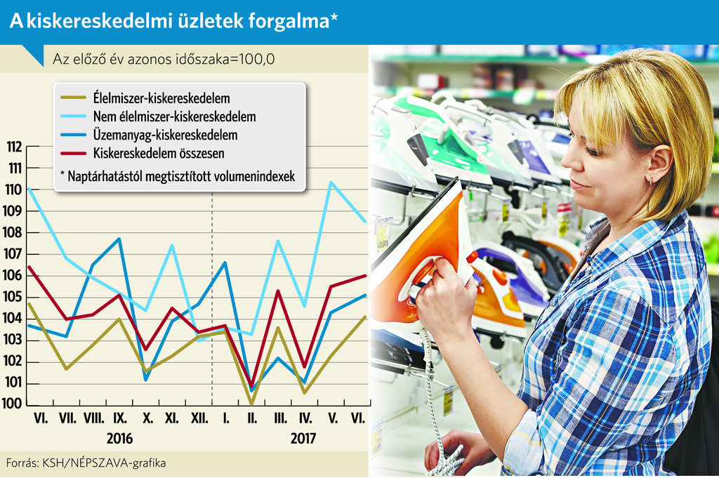 Júniusban változatlanul a nem élelmiszer-kiskereskedelmi üzletek forgalma mutatta a legnagyobb, 8,5 százalékos növekedést, bár némiképp elmaradt az előző havi 10,3 százaléktól. Az üzemanyag-eladások éves növekedési üteme viszont a májusi 4,3 százalékról 5,1 százalékra gyorsult. Az élelmiszer- és élelmiszer jellegű vegyes kiskereskedelmi üzletekben is nagyobb, 4,1 százalékos növekedést mért a KSH az előző havi 2,3 százaléknál.