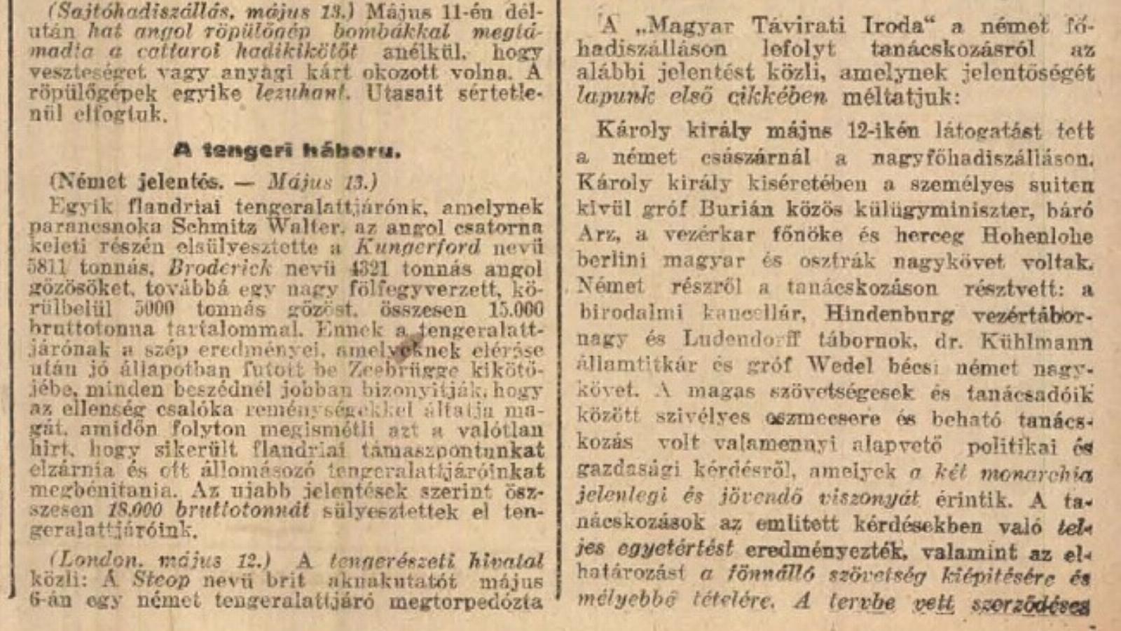 Egyik flandriai tengeralattjárónk, amelynek parancsnoka Schmitz Walter, az angol csatorna keleti részén elsüllyesztette a Kungerford nevű 5811 tonnás, Broderick nevű 4321 tonnás angol gőzösöket, továbbá egy nagy fölfegyverzett, körülbelül 5000 tonnás gőzöst, összesen 15.000 bruttótonna tartalommal.