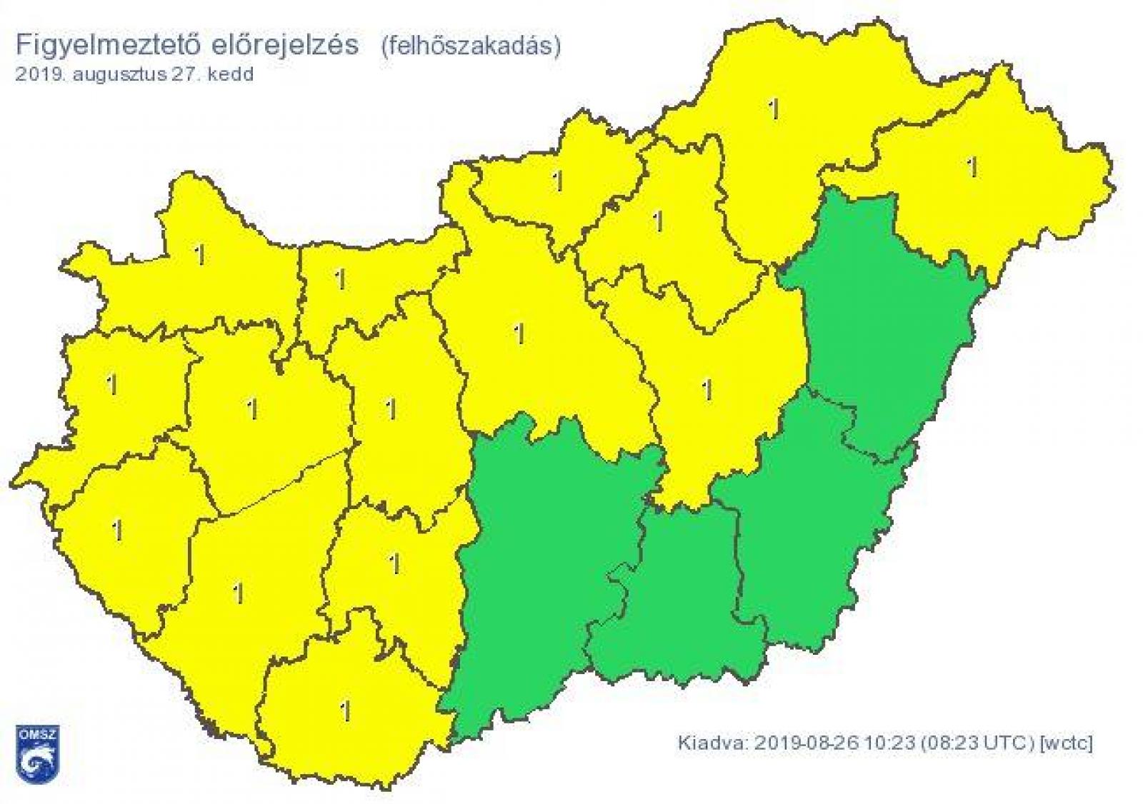 A zivatarok veszélye miatt az egész országban riasztásokat adtak ki a zivatarok veszélye miatt. Bács-Kiskun, Csongrád, Békés és Hajdú-Bihar megye kivételével pedig mindenhol felhőszakadások miatt is figyelmeztetnek.