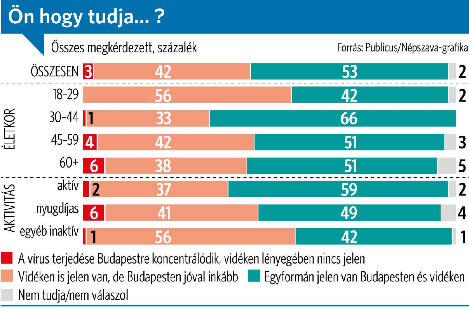 A titkolózás tág teret adott a találgatásoknak. A Publicus Intézet nemrégiben a fővárosiak körében készített felmérést: a megkérdezettek 42 százaléka vélekedett úgy, hogy a vírus vidéken is jelen van, de Budapesten jóval inkább, míg 53 százalék feltételezte, hogy egyformán jelen van Budapesten és vidéken. (Mindössze 3 százalék gondolta úgy, hogy a vírus terjedése a fővárosra koncentrálódik, 2 százalék nem akart, nem tudott válaszolni.)