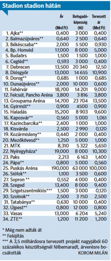 Muszbek Mihály sportközgazdász lapunk március 28-i számában azt mondta, számításai szerint az elmúlt 12 évben mintegy 6000 milliárd forintot fordított az ország a sportra. Ebben az összegben minden benne van, a közvetlenül a költségvetést terhelő kiadások mellett a bujtatott támogatások, a tao, a rendeleti úton kiosztott pénzek, minden. Ennek az összegnek a 40 százaléka a létesítményfejlesztésre ment, a második legjelentősebb részét a labdarúgás kapta.