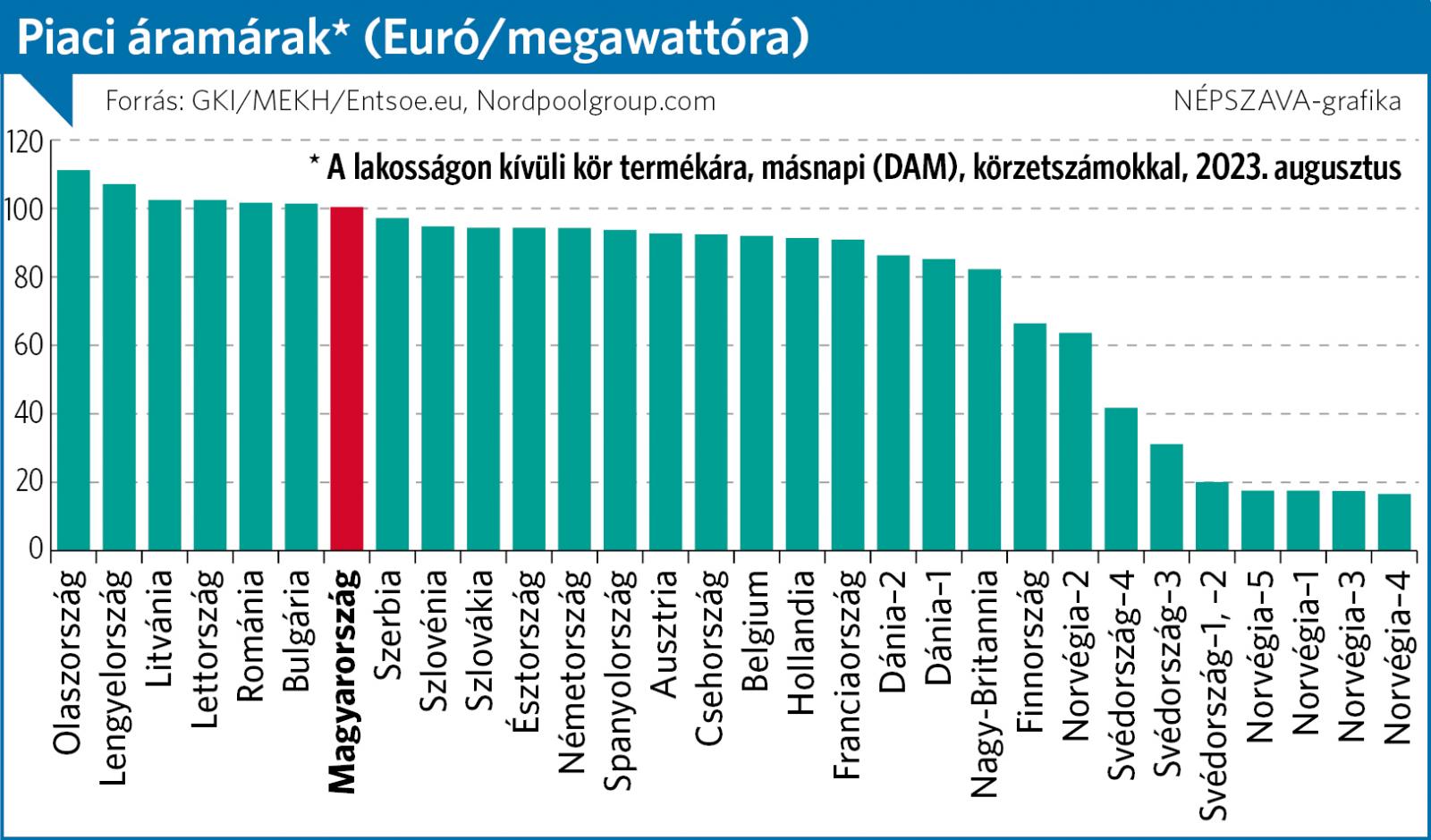 Az augusztusi országos fogyasztás éves szinten 2,9 százalékos csökkenést mutatott. Igaz, az uniós átlag ehhez képest 3,8, a közép-európai pedig 3,6 százalékon állt. Ugyane hónapban Magyarországon EU-szinten a 7. legdrágábbnak számított a villamos energia nagykereskedelmi, piaci (másnapi, Day-Ahead-Market – DAM- -) ára, meghaladva a megawattóránként száz eurót (kilowattóránként – kWh - 39 forintot) is – közlik a Magyar Energetikai és Közmű-szabályozási Hivatal (MEKH) havi piaci beszámolójára hivatkozva. Az árak azóta, nagyrészt a magasabb gázárak miatt, még tovább emelkedtek.