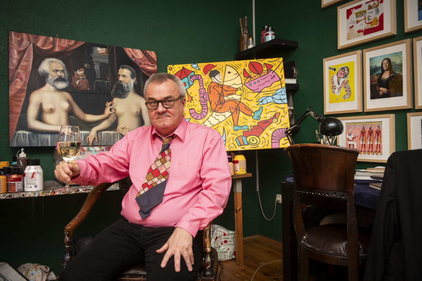 – Körülbelül negyven éve festek, és a művészetem kialakulásának több fázisa volt. Valamikor tinédzserként még graffitis, art brut stílussal kezdtem Újvidéken, az egykori Jugoszláviában, ahol egy garázsban festegettem sprével, meg kentem, csurgattam a festéket, nagy képeket csináltam. Aztán meditatívabb, befelé forduló, filozofikusabb műveket készítettem, aztán amikor a délszláv háború miatt arra kényszerültem, hogy elmeneküljek a hazámból, arra jutottam, hogy az egyén nem tudja elkerülni a társadalom és a történelem hatását. Ezért egyre inkább szociológiai kérdésekkel kezdtem el foglalkozni, eleinte csak metaforikusan az egyén és a környezete relációjában, majd a kétezres évek elejétől már konkrét személyeket és témákat jártam körbe, például a magyar és a nemzetközi történelmet és politikát. A jövőben szeretnék egy nagyszabású kiállítást rendezni, melyen a különböző korszakaimat párhuzamosan bemutathatom, így akik csak az újabb kori művészetemet ismerik, azok is láthatnák, honnan indult ez a történet negyven éve, és haladt fokozatosan egy társadalmi-közéleti megnyilatkozás felé.