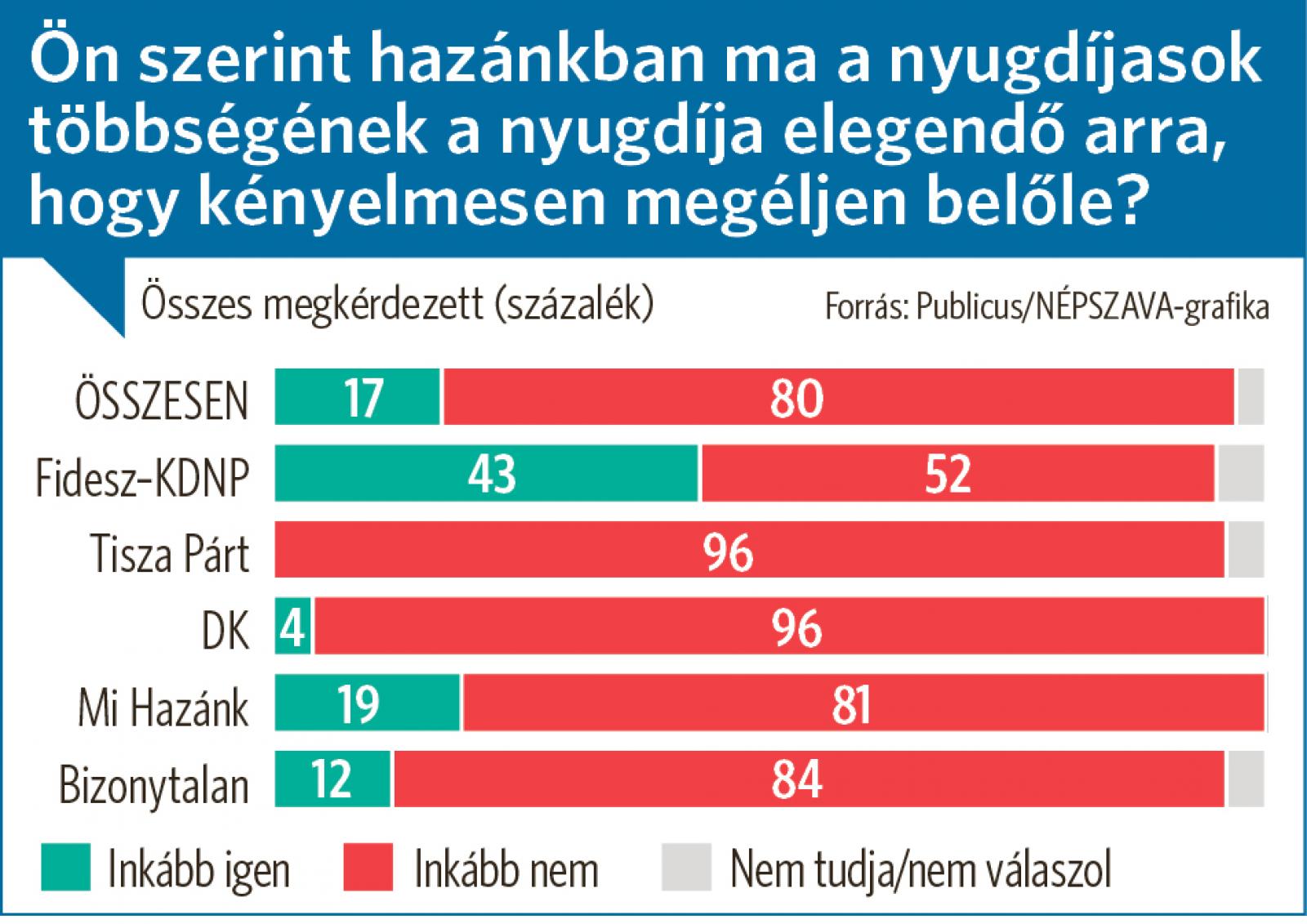 Tízből nyolc ember szerint ma Magyarországon a nyugdíjasok többsége számára a nyugdíj összege nem, vagy „inkább nem” elegendő arra, hogy kényelmesen megéljenek belőle – derült ki a Publicus Népszava számára készített, márciusi reprezentatív kutatásából. A legpozitívabban a Fidesz szavazói gondolkodnak a nyugdíjakról, közülük 52 százalék gondolja kevésnek az ellátást, az ellenzékiek körében ez 95, a bizonytalanoknál 84 százalék.