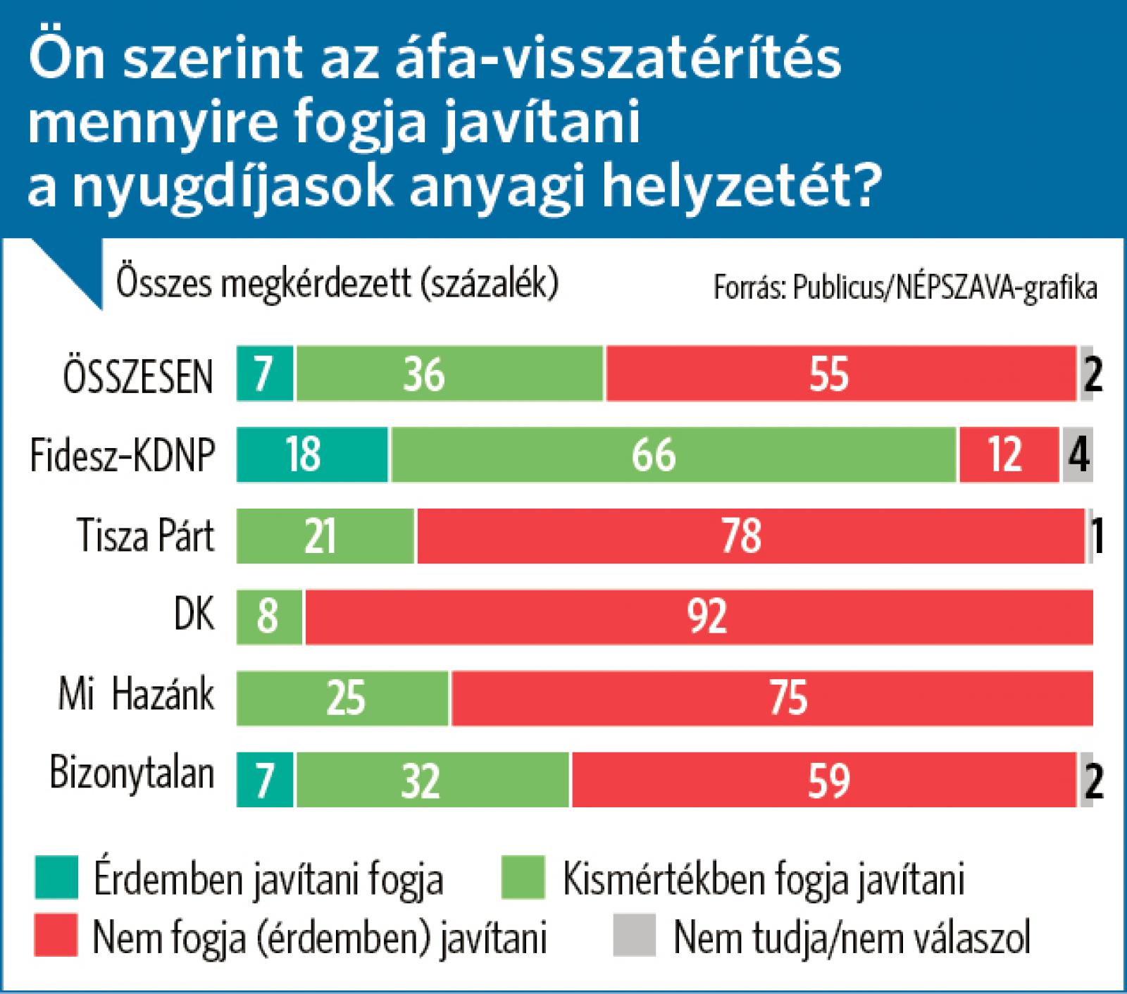 Alig javít a legrászorultabb nyugdíjasok helyzetén az áfa visszatérítéseOrbán Viktor nagyon szeretné, ha az emberek értenék, miről szól a nyugdíjasok áfavisszatérítéseÖsszességében a magyarok 77 százaléka szerint inkább más módon kellene javítani a nyugdíjasok anyagi helyzetét, 19 százalék szerint viszont ez egy jó intézkedés. Az emberek egy százaléka pedig úgy gondolja, a nyugdíjasok anyagi helyzete már így is jó, nem is kell rajta javítani. Ebben a kérdésben is a kormánypárti szavazók között vannak a legtöbben, akik ezt egy jó intézkedésnek tartják – minden második fideszes így gondolja, 43 százalékuk viszont más intézkedésekre lenne szükség. Az ellenzékiek 94, a bizonytalanok 83 százaléka más megoldásokat várna a kormánytól az idősek anyagi helyzetének javítására.
