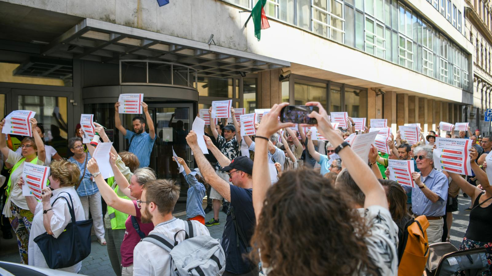 Nem akarták a kutatóközpontok, mégis elcsatolják őket, egy elnök és egy miniszter kámforrá váltA Nyelvtudományi Kutatóközpontban 88, a Bölcsészettudományi Kutatóközpontban 92, a Közgazdaság- és Regionális Tudományi Kutatóközpontban 93 százalékos az egyetemmel való fúzió elutasítottsága. Még délután a Tudományos Dolgozók Demokratikus Szakszervezetének (TDDSZ) kezdeményezésére demonstrációt tartottak az érintett dolgozók képviselői, akik először a Kulturális és Innovációs Minisztérium előtt gyűltek össze, hogy átadják a csütörtökön egy dolgozói fórumon elfogadott nyilatkozatukat Hankó Balázs kulturális és innovációs miniszternek.