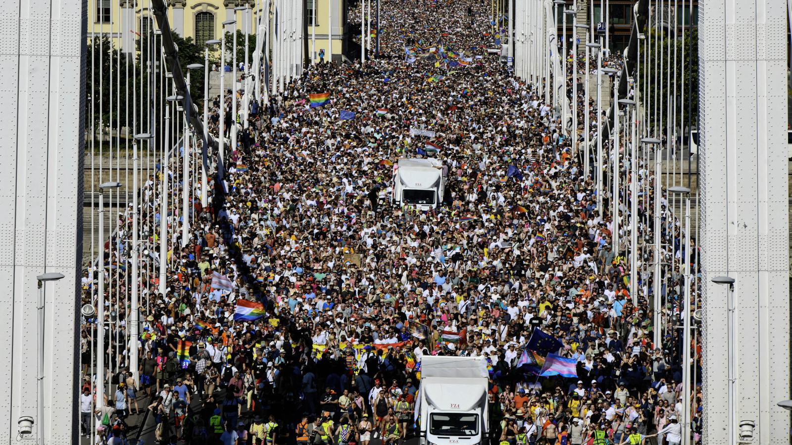 Azért a szivárvány az úr – Percről percre a betilthatatlan Budapest Pride-rólA rendőrség kérdésre sem közölt becslést arról, hogy mennyien lehettek jelen a rendezvényen, Mérő László matematikus viszont minimum 200 ezer fősre saccolta a rendezvényt a tömeg sűrűsége és az alapján, hogy a menet egy ponton a Budapesti Műszaki- és Gazdaságtudományi Egyetemtől egészen a Deák Ferenc térig ért, zsúfolásig megtöltve az Erzsébet hidat.