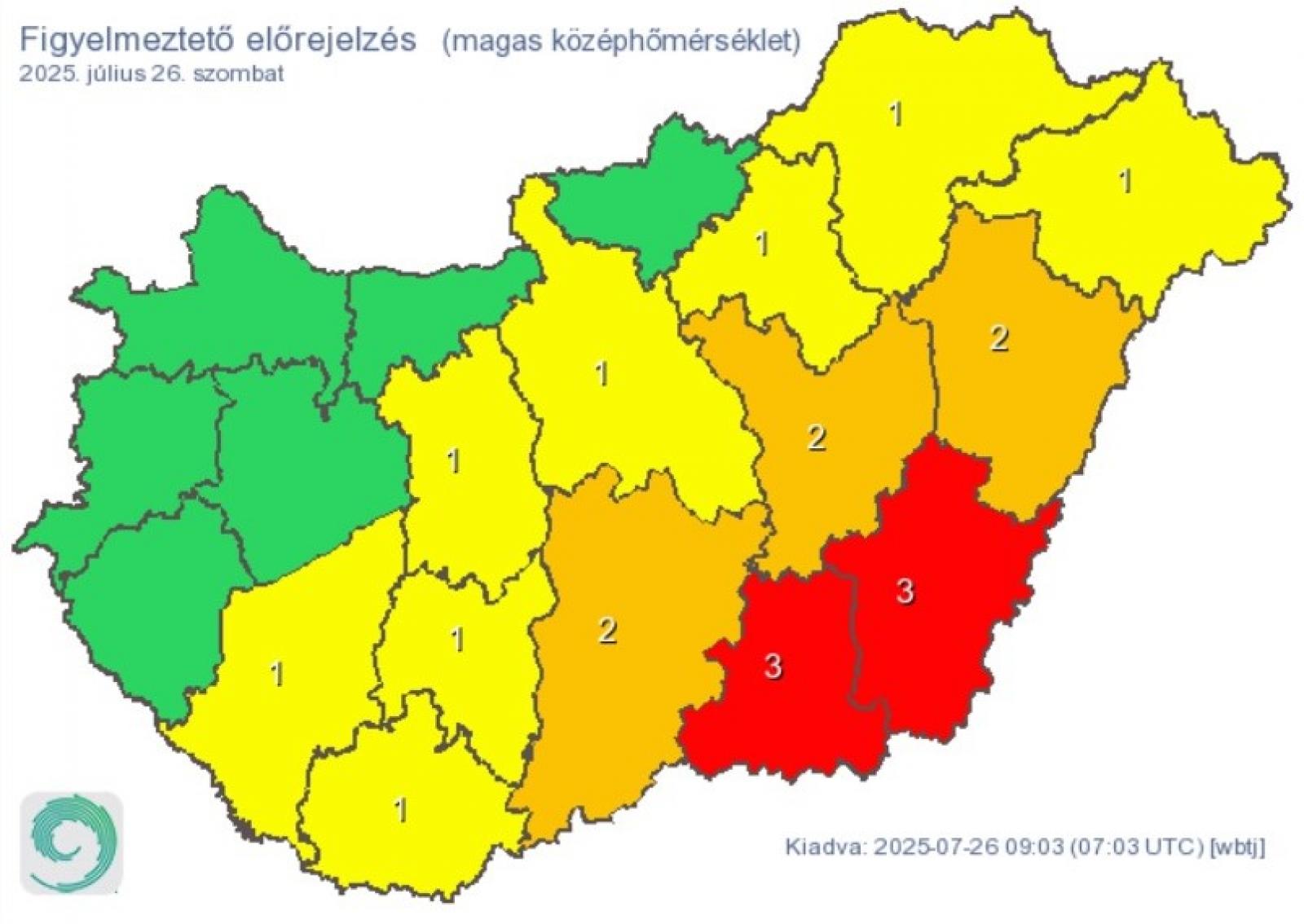 Az északnyugati részek kivételével 25 és 29 fok között, délkeleten 29 fok felett alakulhat a napi középhőmérséklet. A hőség miatt Békés és Csongrád-Csanád vármegyére a legmagasabb, harmadfokú figyelmeztetést adták ki.