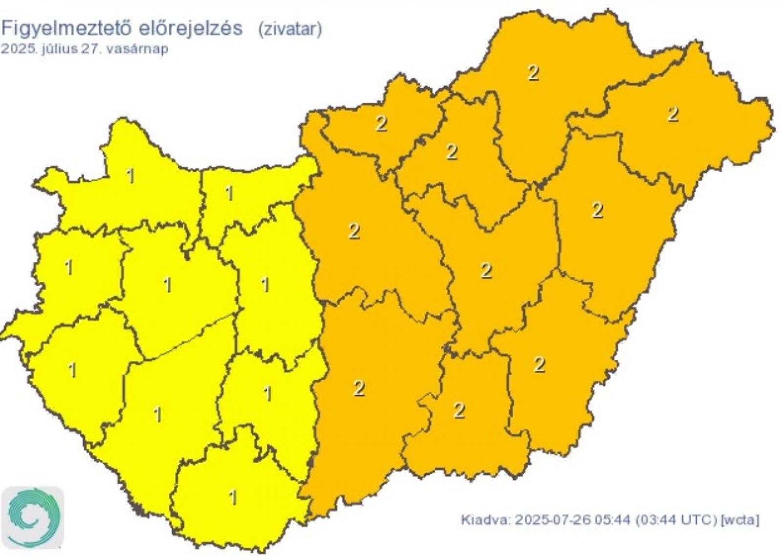 A várható zivatarok miatt Komárom-Esztergom és Veszprém vármegyében elsőfokú, az ország többi részén másodfokú figyelmeztetések vannak érvényben, miközben felhőszakadásra is országszerte számítani kell.
