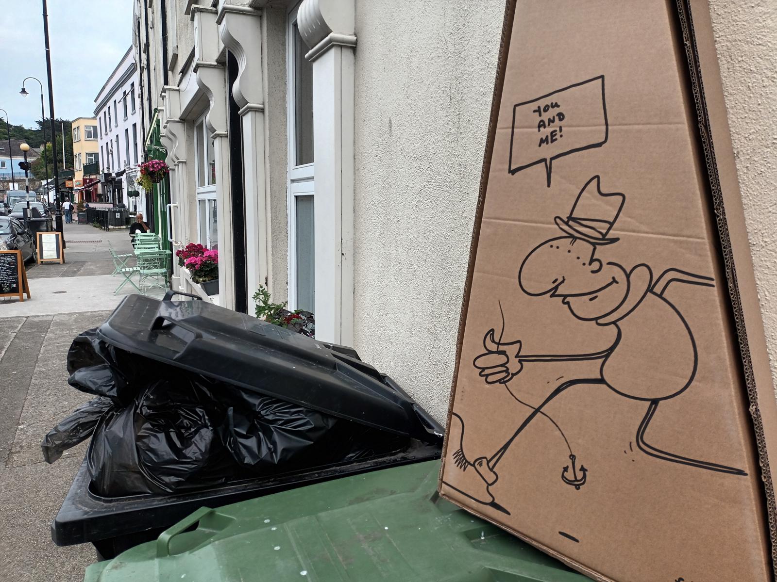 Odanézek a falra, felhúzom a szemöldököm, basszuskulcs! A gyerekeim, akik ugye nem mélyedtek el eddig nagyon a magyar zászló rejtelmeibe, nem vették szigorúan a színkombót. Mivel a piros színt nem lelték meg, narancssárgát kentek fentre, meg a zöld sem az a haragos ...egyszóval, felfestettek egy majdnem ír zászlót, a szabad ír zászlót a királyságpárti negyed kapujával szemben, pár zord szülő már fészkelődik a másik oldalon, tényleg olyan kafa, hogy egy egyszerű családi sétát nem tudunk abszolválni, mindig megtaláljuk a szart a palacsintában.