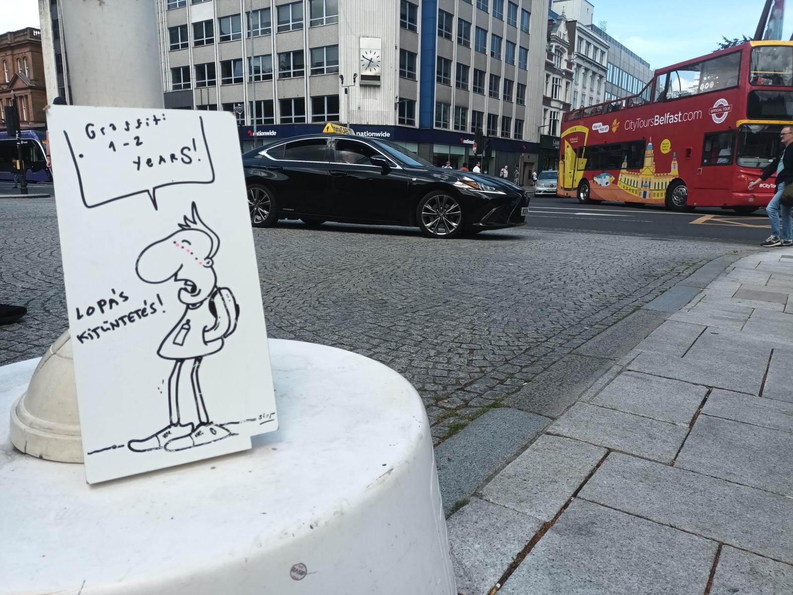 A harmadik napon a feleségem javasolta, hogy fizessünk be egy városnéző buszos túrára. Első reflexből azonnal arra gondoltam, micsoda kispolgári attitűd ez, de aztán arra jutottam, nem kell mindig a punkot játszanom. Ahhoz képest, hogy milyen gondolataim voltak gyerekvállalásról vagy kulturált borfogyasztásról, rendezett napirendről korábban, már megtanultam, hogy nem kell mindent azonnal csuklóból elutasítani. A busz a belvárosból indult, és meglepetésemre nagyon tetszett a dolog. A túra lényege, hogy bármikor és bárhol le lehetett pattanni a buszról, majd a következő járműre megint fel, s eszerint meg lehetett nézni a városban a palotákat, ginlepárlót, börtönmúzeumot, hajókat, Titanic múzeumot, mindent. Mi arra jutottunk, hogy a nagy falnál, a Béke Falnál szállunk le először, ami a polgárháború alatt elválasztotta a két oldalt. Rita már volt itt, azért is mondta, rám gondolva, hogy ez legyen az első. Jelzünk. Semmi. Nézem Ritát, de a busz csak robog tovább velünk. Na jó, gondolom, ez a hajó elment, de szerencsére a párom lepattan az emeletes busz felső polcáról, és megállíttatja az emeletest. A sofőr pironkodik, azt hitte, csak a gyerekek nyomták meg a gombot. Olyan barátságos, de mindenki más is, hogy nehéz elképzelni a néhány évvel ezelőtti élet-halál harcot.