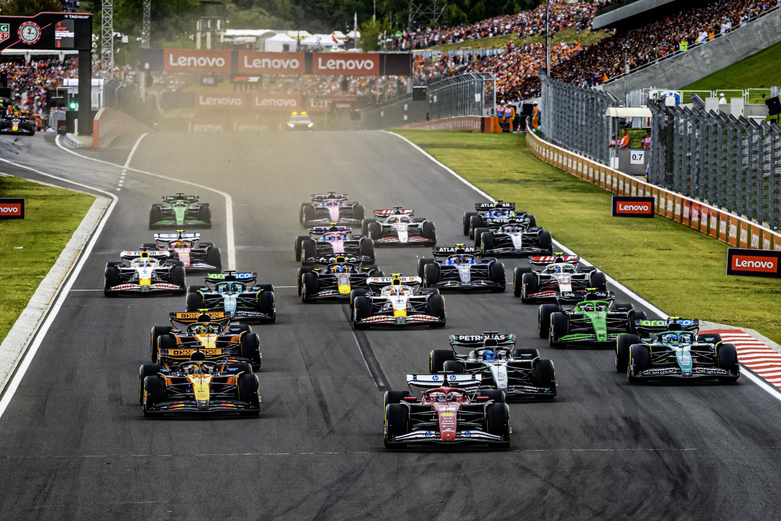 A rajtnál Leclerc remekül jött el és az első kanyarba gond nélkül fordult be az első helyen. A két McLaren-versenyző csatájából közben Norris jött ki nagyon rosszul, a mögötte érkezők közül ugyanis ketten - Russell és Fernando Alonso (Aston Martin) - is meg tudták előzni, miután a Piastri elleni küzdelemben nem helyezkedett túlságosan jól. Kisvártatva aztán Norris lehagyta Alonsót, az ötödik körben így Leclerc, Piastri, Russell, Norris, Alonso volt a sorrend az első öt helyen. Közben a nyolcadik pozícióból startolt, címvédő Max Verstappen egyet tudott előzni a Red Bullal, így Gabriel Bortoleto (Sauber) mögött hetedik volt.
