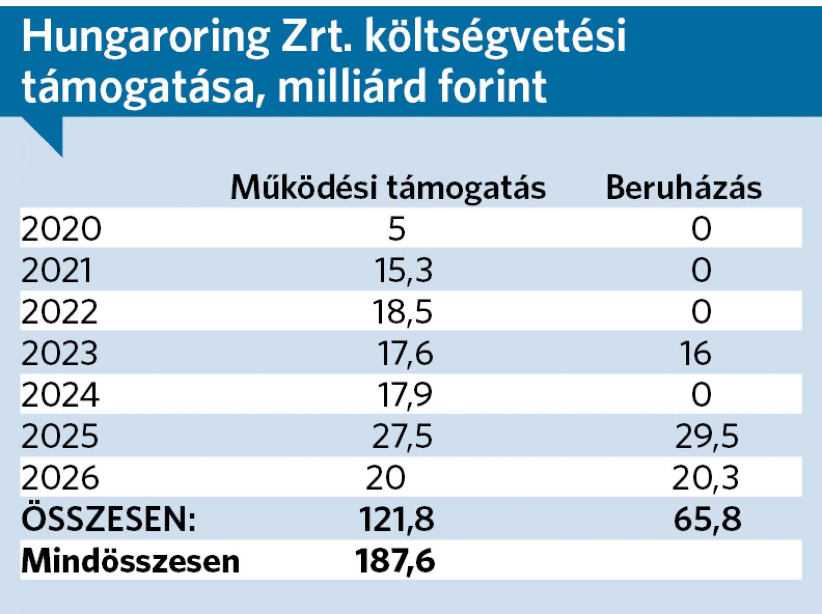 Ebből 27,5 milliárd megy a működésre, a rendezői jogdíjak kifizetésre, és 29,5 milliárdot terveztek a már megkezdett és folyó beruházások finanszírozására. Ezek alapján, ha komolyan vesszük Szijjártó Péter állítását, hogy a Forma-1 verseny rendezése az idén 20-25 milliárd forinttal növeli a GDP-t, vagyis a bruttó hazai összterméket, a nemzeti jövedelmet, ez önmagában képtelenség, mivel az évi 57 milliárdos kiadásból csak 20-25 milliárdos jövedelem keletkezik nemzetgazdasági szinten. Mindez arra utal, hogy óvatosan kell bánni a politikusok által közölt számokkal. Lapunk számítása szerint 2020 óta különböző jogcímeken összesen 187,6 milliárd forint támogatást kapott, illetve kap a Hungaroring Zrt. a költségvetésekből, s ebben a már benne van az elfogadott 2026-os költségvetési törvény alapján járó 40 milliárd forintos kiadás is.