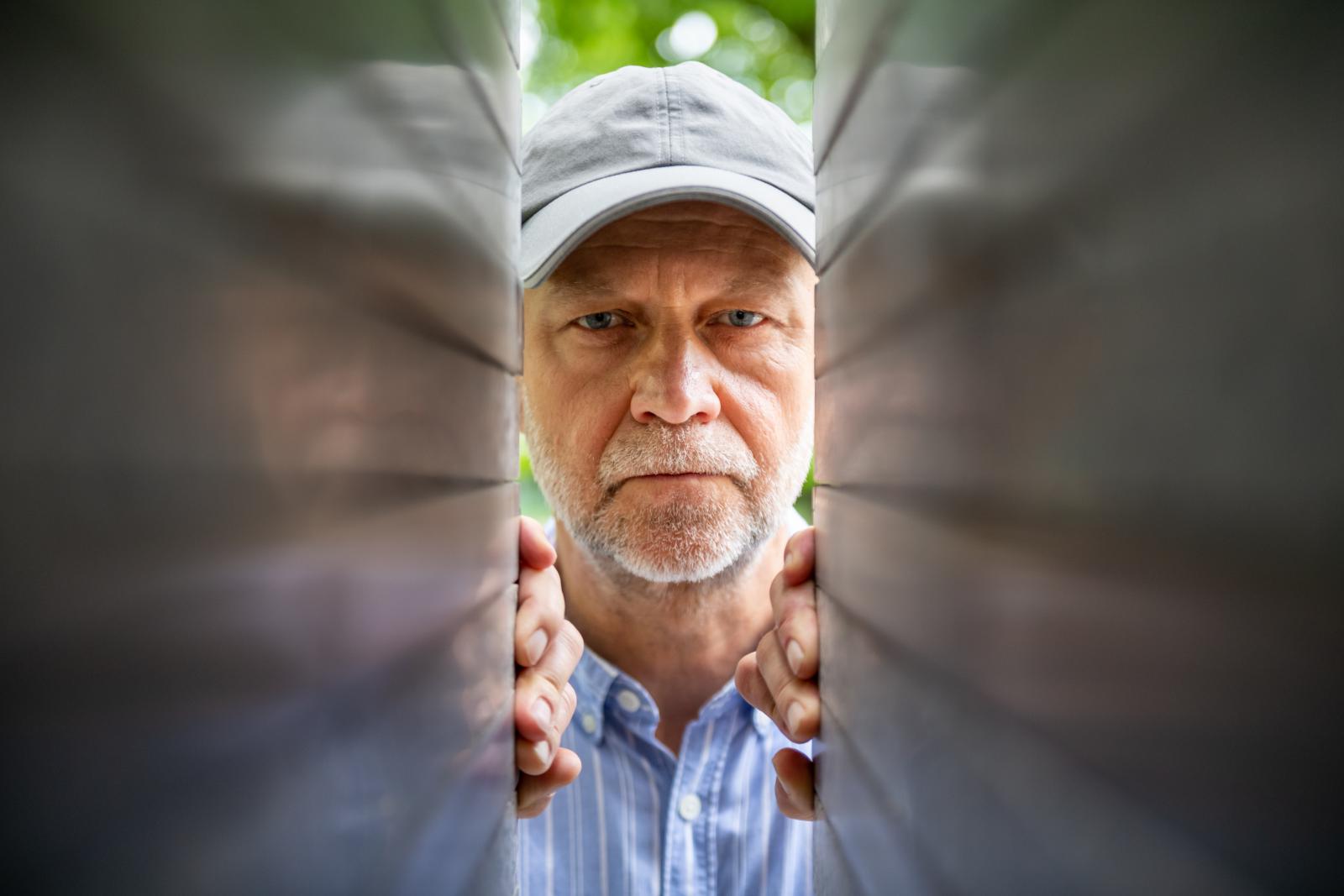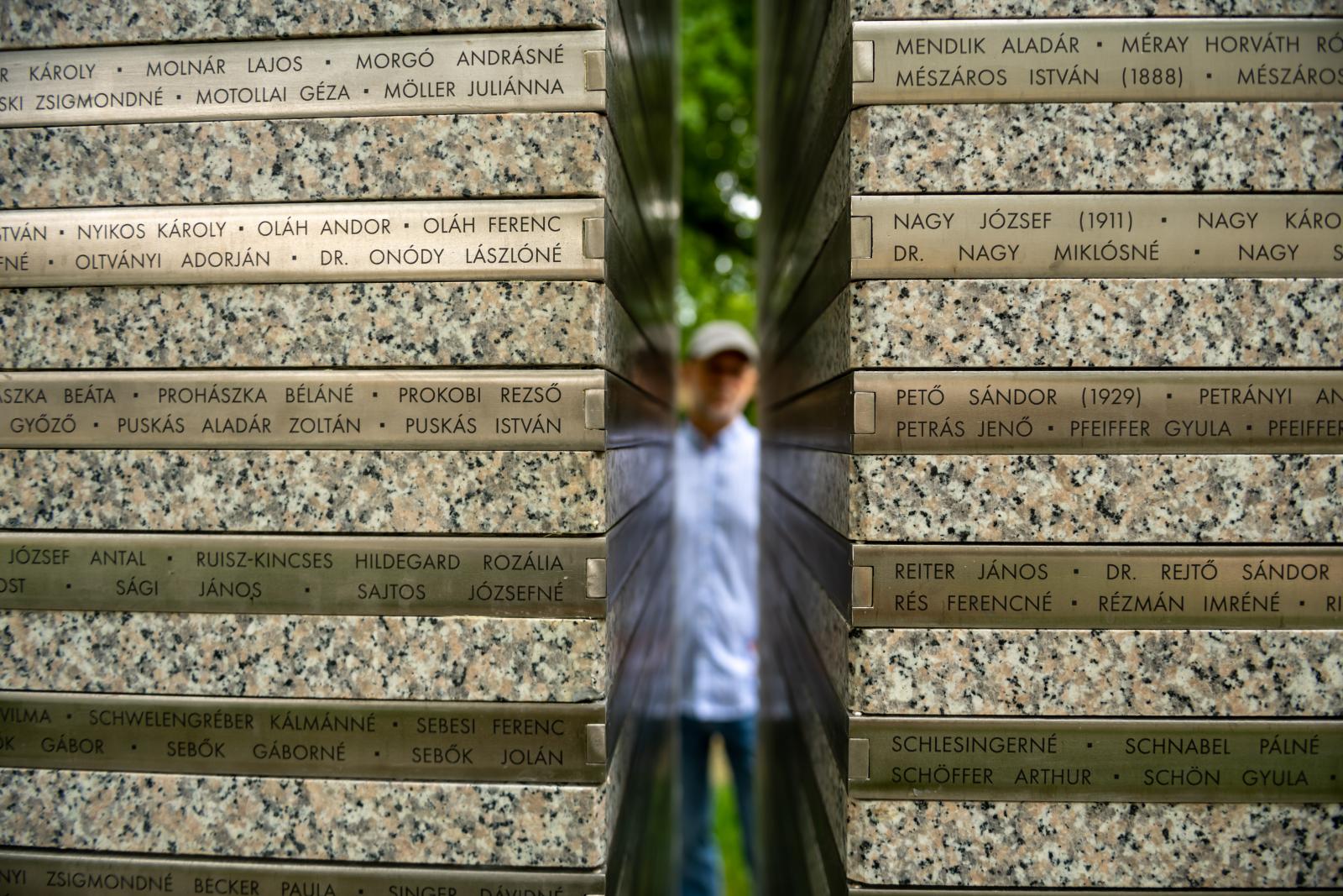 Az Emlékmű című alkotásra azonban felkerült mind az ezerötszáztizenhárom áldozat neve, melyeket huszonöt sor fémcsíkba gravíroztak bele. A mű tetején pedig egy fordított kereszt negatív formája rajzolódik ki a két gránittömb között, mellyel a művész a téren álló Árkay Aladár és Árkay Bertalan tervezte templom harangtornyának keresztjére reflektált. – 1944-ben a Városmajori parkban Kun páter prédikált, aki a nyilas tömeggyilkosságokban aktívan részt vett. Akkor a nyilasok tömegével gyilkoltak embereket a Városmajor utcában, az Istenhegyi úton, másokat pedig a Lánchíd mellett a Dunába öltek. Az Alma utcában, a Maros utcában, a Városmajori parkban több száz emberrel végeztek. Emiatt a templom ikonikus harangtoronyára tekintve fordítva láttam meg a keresztet, és a szobrom két gránittömbjéből is ennek formának a hiánya rajzolódik ki. Az utóbbi két tömb a mózesi kőtáblákra is utal, melyek parancsolatai között az egyik azt tanítja, hogy ne ölj. Amikor megnyertem a pályázatot, féltek attól, hogy politikai akciókat fogok csinálni. De én nem akartam ilyet, hanem a szobrommal a közös emlékezésnek akartam lehetőséget adni.