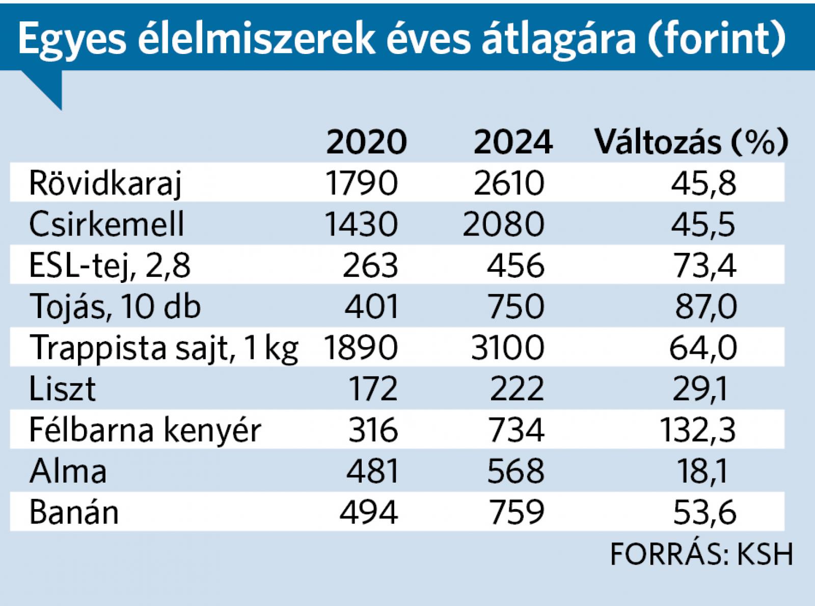 A KSH adatai – és a Népszava összesítése – szerint 2020–2025 júliusa között az infláció 48,9 százalék volt, a nyugdíjas infláció ennél egy kicsit magasabb, 50,4 százalék. Ezen belül az élelmiszerek ugyanezen időszak alatt 72 százalékot meghaladó mértékben drágultak, a szeszes italok és dohányáruk esetében pedig átlag feletti volt az áremelkedés: itt 53,5 százalék volt az infláció. Néhány élelmiszer esetében is egészen extrém áremelkedés zajlott le: a félbarna kenyér már 2024-ben kétszer annyiba került a KSH árfelírói szerint, mint 2020-ban. De duplázódtak a zöldség- és gyümölcsárak is, jelentősen drágultak a tejtermékek, vagyis a mindennapi, alap fogyasztási cikkek árai.