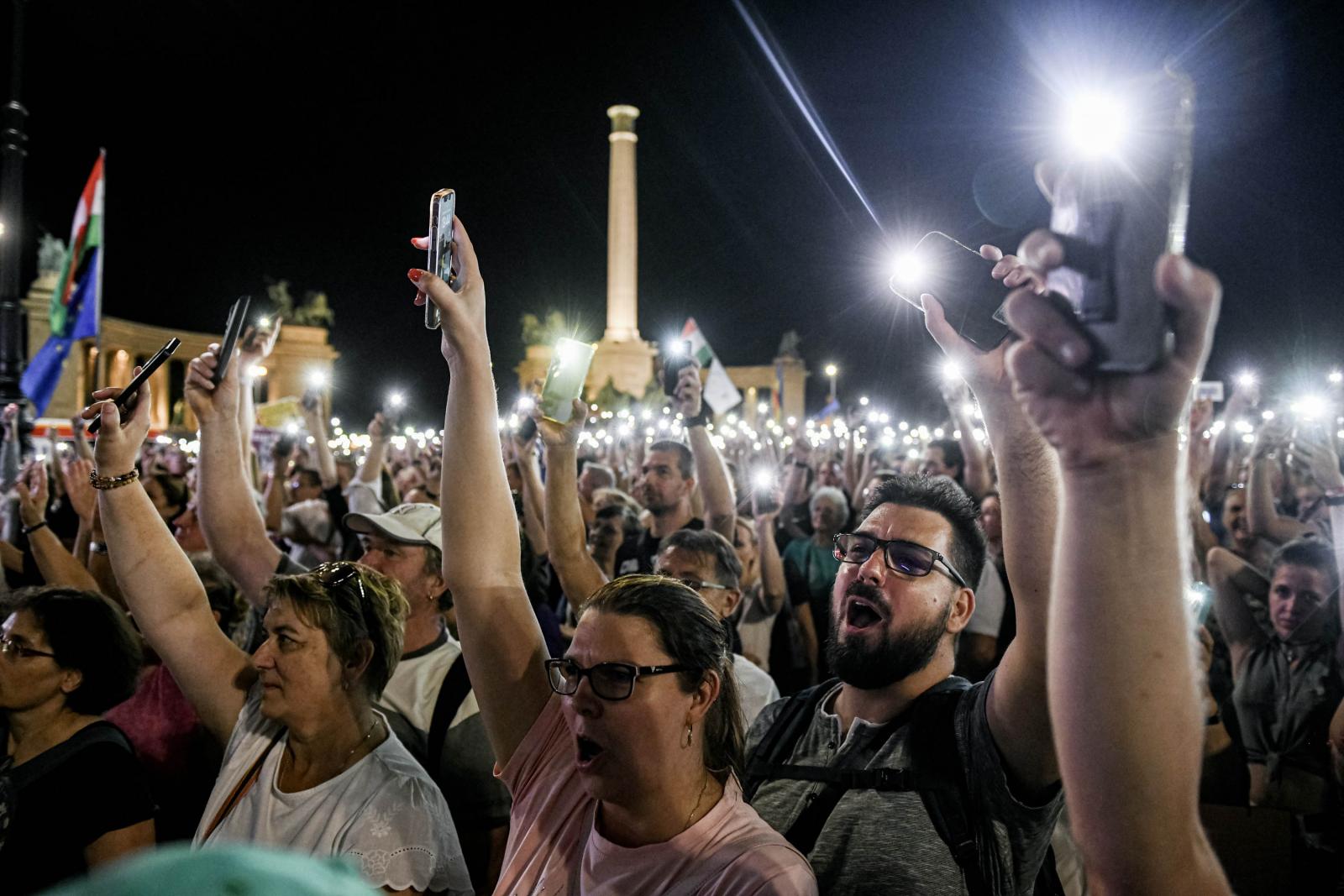 A Hősök terén tényleg elég sűrűn áll a tömeg, a Dózsa György út Andrássy út felőli oldalán a tüntetőknek gyorsan szét kellett nyílniuk, hogy átengedjenek egy mentőautót.