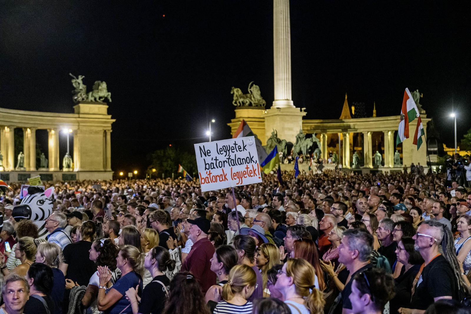 Országunkat elmebeteg emberek vezetik, elmebeteg célokkal! – hirdette egy felirat a színpad közelében. A kézzel írt táblát tartó férfi – az egy éve nyugdíjas Tibor, aki korábban földmérő mérnökként dolgozott – elmondta a Népszavának, hogy a transzparenst külön erre az alkalomra készítette. Akármelyik oldalt nézzük is – tért rá a rendezvény apropójára –, a (hazug) propagandának nincs köze a demokráciához, ahogyan a gyűlölködésnek, a másik sárba tiprásának sincs köze egy normális társadalom légköréhez.