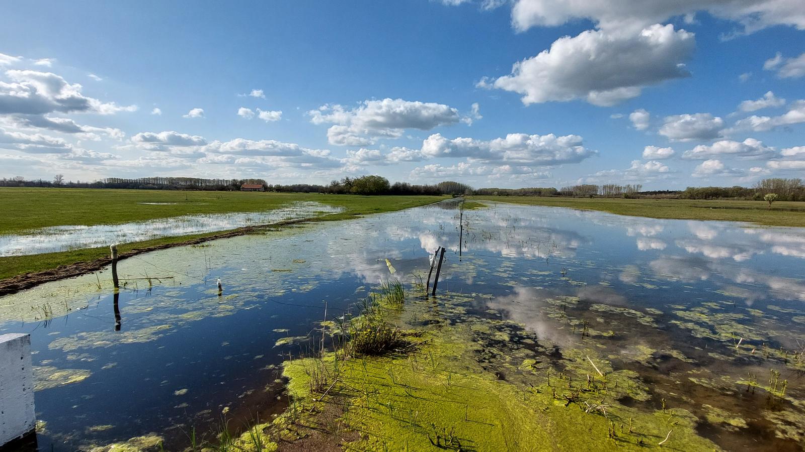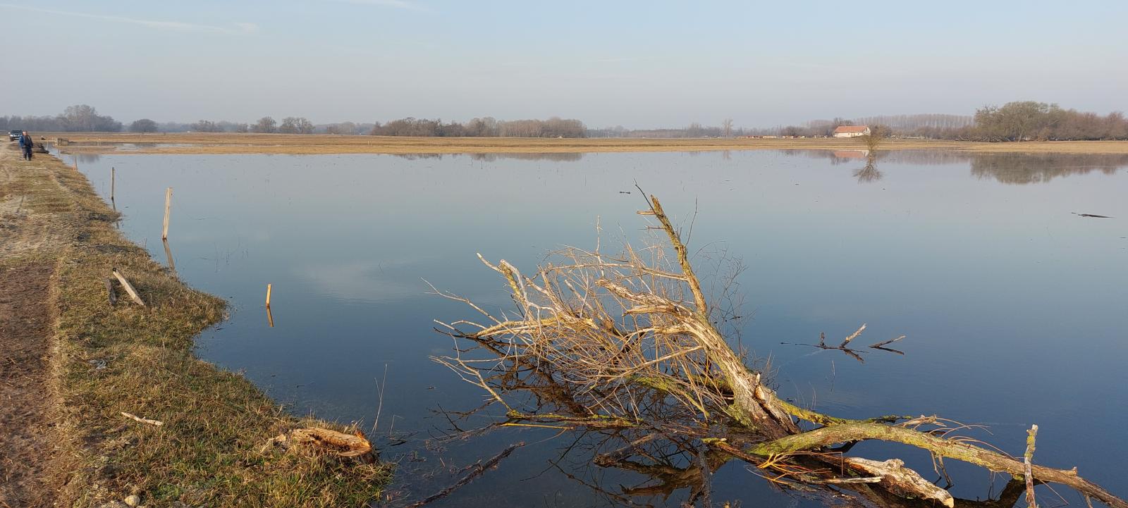 Bár ottjártunkkor éppen esett az eső, az szinte semmit sem ért. A homokos talaj felső egy centimétere vizes volt ugyan, de az alatta lévő rész csontszáraz. Mindez jól látszott a földúton is, az autók kereke által formált vájatok mentén. A változó éghajlat lenyomatát a táj is magán viseli: a növényvilág is igyekszik alkalmazkodni a gyorsan változó körülményekhez, a földút mentén homoki gyepfajok jelzik, hogy változnak a körülmények. A tavaszi árasztás helyére kiérve természetesen már nem volt víz, egykori helyéről kikandikáló nádcsonkok és egy élelem után kutató nagy kócsag tanúskodott. A vízőrzők pedig készülődnek, hogy már idén év végén újra eláraszthassák a kijelölt területet: látogatásunk során éppen a fürdő felől érkező csatornarendszer átereszeit tisztították.