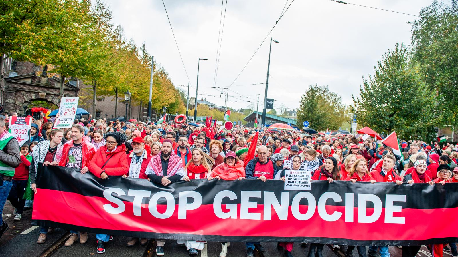 A résztvevők az eső ellenére is végigjárták a holland fővároson keresztül vezető, hat kilométer hosszú útvonalat, miközben palesztin zászlókat lengettek, „Szabad Palesztinát!” skandáltak, és olyan feliratokat tartottak, mint „Izrael, szégyelld magad!” vagy „Nem lehetünk szabadok, amíg Gáza nem szabad!”. A szervezők szerint a holland kormány nem tesz eleget annak érdekében, hogy megakadályozza Izraelt háborús bűnök elkövetésében Gázában, ezért politikai intézkedéseket sürgettek.