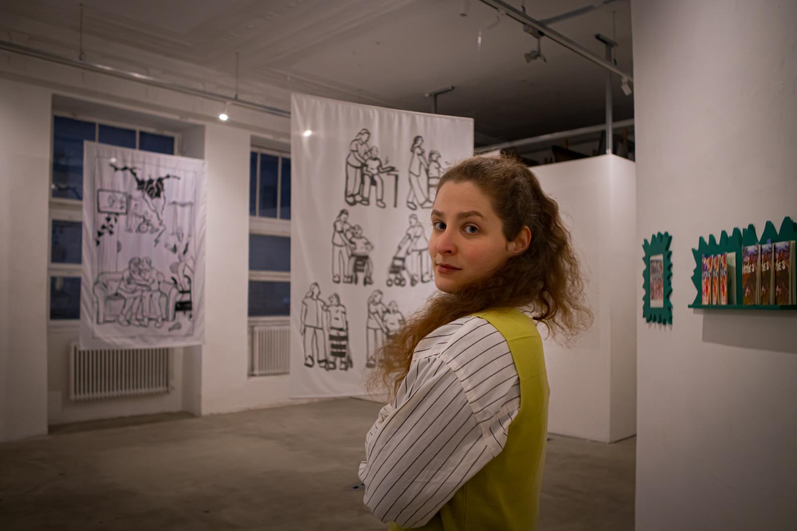– Amikor ezt a tárlatot terveztem, az érdekelt, hogyan lehetne a képregény műfaját kiterjeszteni egy kiállítótérben, ezért is akartam a rajzokat textilekre is felvinni, és azokat a tér különböző pontjain installálni – mondta Dorottya, aki képzőművészként végzett, de idővel belekóstolt a képregények világába, és úgy döntött, maga is rajzol egyet. 2023-ban született meg az első zine-je – azaz mikrokiadó által megjelentetett, ISBN- és ISSN-számmal nem rendelkező kiadványa –, a most megjelent képregénye pedig egy korábbi folytatása, a művész 2024-ben már kiadott egy boszorkányos tematikájú füzetet Witches (Boszorkányok) címen, most pedig a More Witches (Még több boszorkány) című füzete látott napvilágot.
