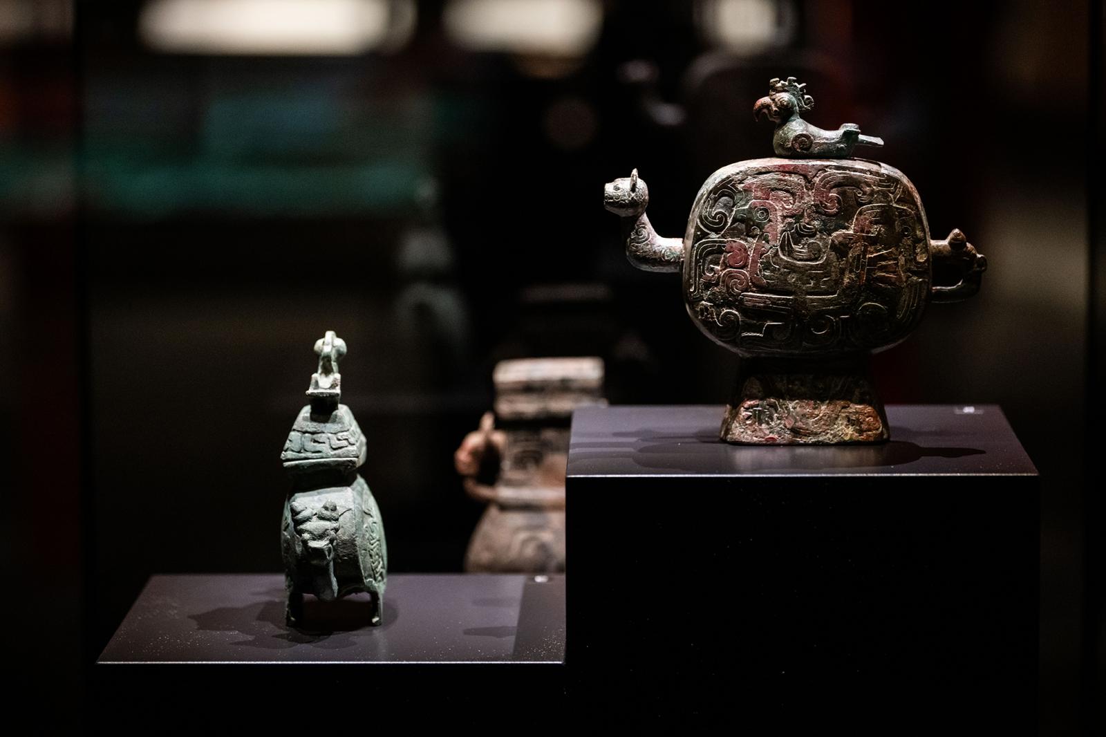 A szellemfal mögött bronz szertartási edények vezetnek be a kínai ókori gondolkodásba. Ennek egyik alapvetése az ötösség: az Öt Elem (Wu Xing) rendszerének színei (fekete, vörös, kék, fehér, sárga), a hozzájuk kapcsolódó elemek (fa, tűz, föld, fém, víz) az irányok, (észak, dél, kelet, nyugat, közép), továbbá az évszakok (tavasz, nyár, ősz, tél, és a változás, vagy átmenet ideje). Az étel- és italáldozatokat szolgáló edények az ősöknek bemutatott áldozatokhoz hastnálták: az ókori Kínában úgy gondolták, az ősök szellemei biztosítják a jelenben élőknek a jólétet, az elhunytak és az élők pedig ugyanannak a világnak a két felét jelenítik meg. Azok a jádefaragványok pedig, amiket a ruháikon fölfüggesztve hordtak, szintén az Öt Elem tanához kapcsolódnak: az öt érzékkel (tapintás, látás, szaglás, hallás, ízlelés) a világ megismerésére lehet törekedni.