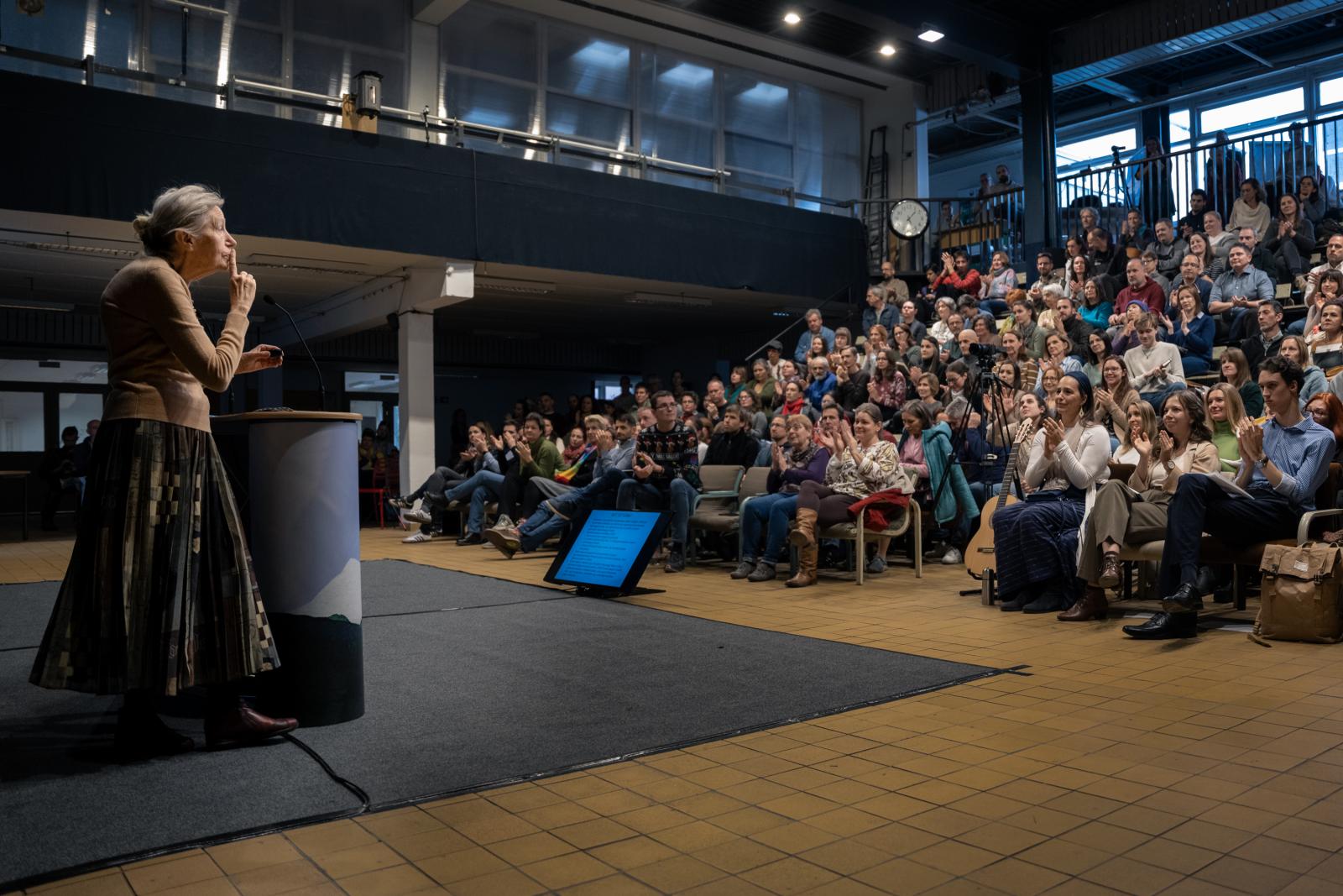 A levegőben frissen főtt növényi teák illata szállt, miközben a kiállítók – köztük a Jane Goodall Intézet és a Tudatos Vásárlók Egyesülete – standjainál már reggeltől pezsgett az élet. A rendezvényt a házigazdák, Fait Federika, a zCast, HVG fenntarthatósági podcastjának és Litkai Gergely, a Zöld Válasz podcast műsorvezetői azzal vezették fel, hogy 2075-ben a klímaváltozás már nem fenyegetés, hanem múltbeli tanulság. „Környezeti lábnyomunk csökkentésére tudom ajánlani a fekvőgipszet” – ironizált a humorista, olyan oldott hangulatot teremtve, amelyben a hallgatók is egyre nyitottabbá, befogadóbbá váltak.