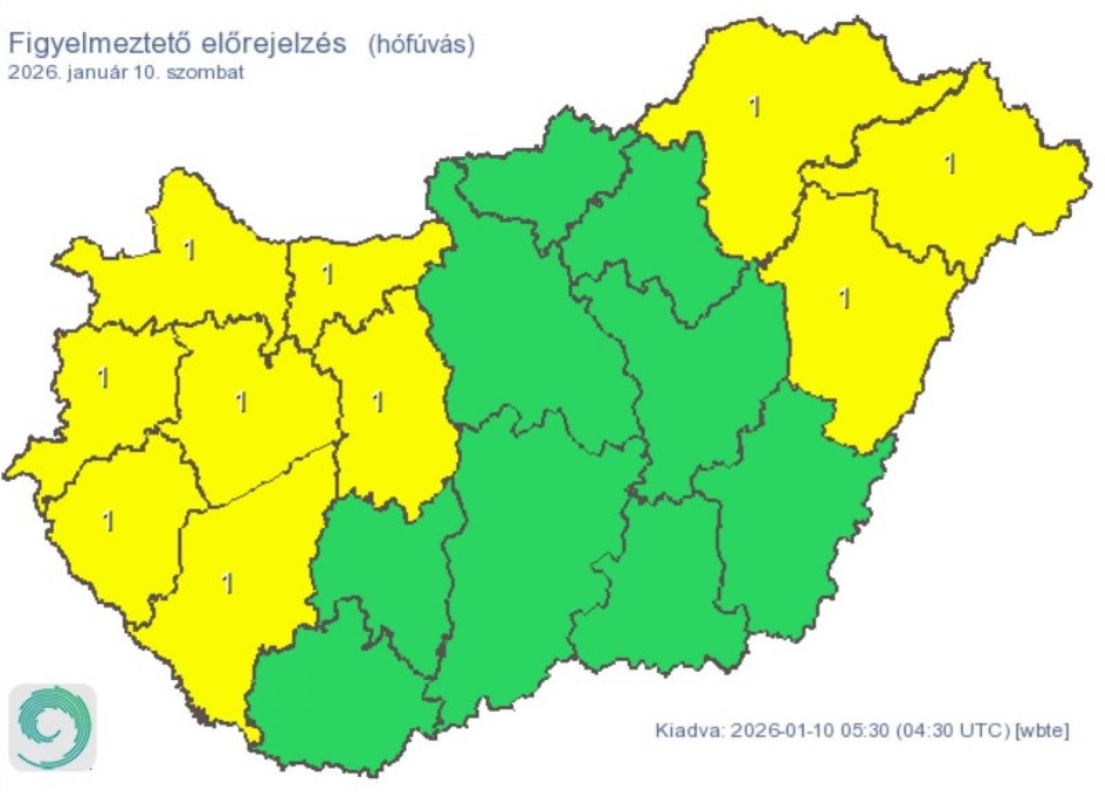 Tíz megyére (Borsod-Abaúj-Zemplén, Fejér, Győr-Moson-Sopron, Hajdú-Bihar, Komárom-Esztergom, Somogy, Szabolcs-Szatmár-Bereg, Vas, Veszprém és Zala) hófúvás, további öt megyére (Baranya, Bács-Kiskun, Somogy, Tolna és Zala) pedig ónos eső miatt adott ki elsőfokú figyelmeztetést a meteorológiai szolgálat.