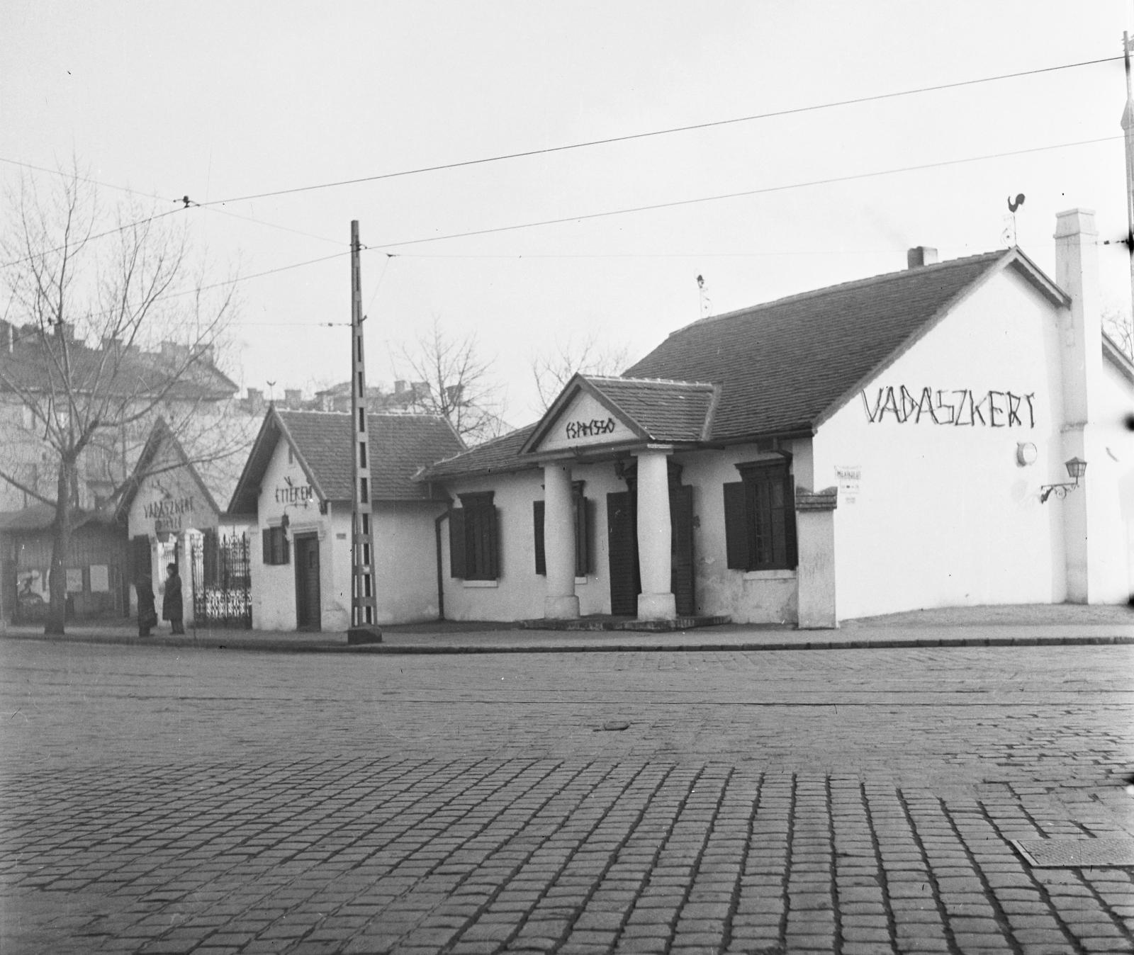 Az 1944-es légi felvételeken még látszik a Trieszti nő és a Mexikói útra rálógó tornyos villa is. A telekről aztán csak 1952-ben jelent meg a következő híradás: a Magyar Nemzet arról tudósított, hogy az ostromban elpusztult a vendéglő, de a romok eltakarításakor kiderült, hogy a ház szerkezetében megmaradt egy korábbi vadászlak kétoszlopos, kúriaszerű homlokzata. Így azt állították helyre, immár Vadászkert néven. Ha látni szeretnék a Városliget előtti idők e hírmondóját, vessenek egy pillantást a hajdani sörkert helyén terpeszkedő etetőkombinátra: a házikó ott lapul ma is, épp előtte fordul a villamos.