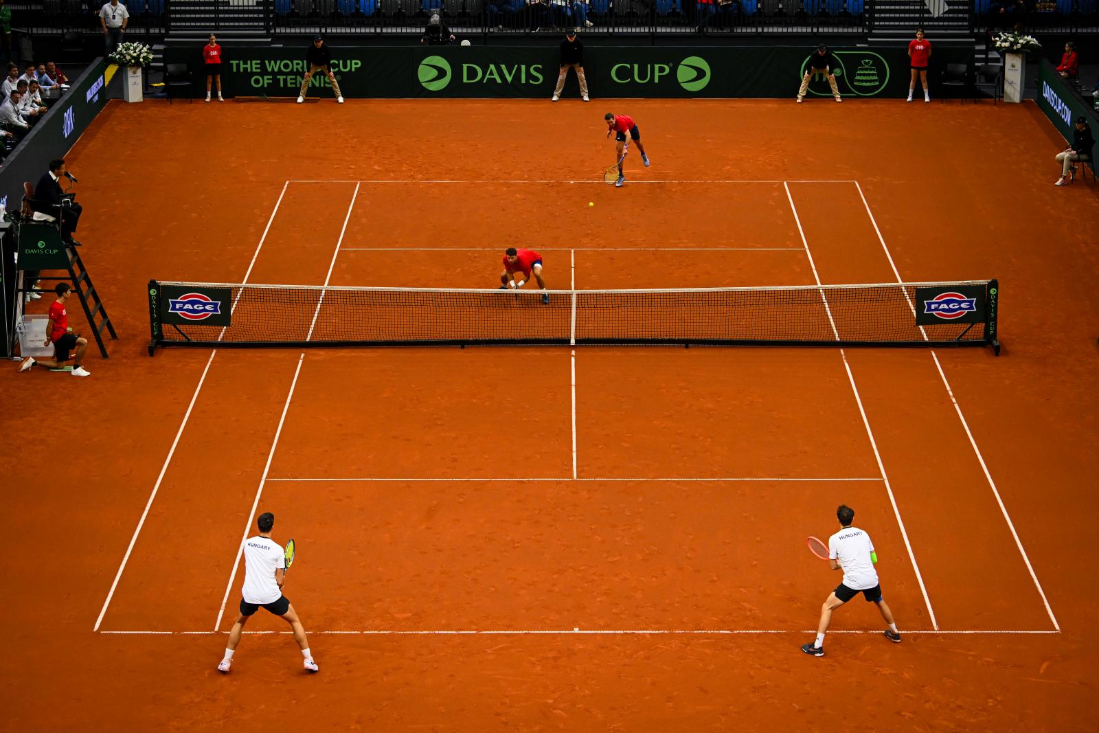 Korántsem volt már annyi néző, mint előző nap, amikor remélték, Piros Zsombor csodát tehet világranglista-22. ellenfele ellen, vagy első számú férfi teniszezőnk legyőzi a salakon kevesebb tapasztalattal rendelkező, Davis-kupa-újonc Ethan Quinnt, de a hangulat így is remek volt a Tatabányai Multifunkcionális Sportcsarnokban, a magyar vezérszurkolók gondoskodtak róla, hogy játékosaink megkapják a nekik járó biztatást, és a maréknyi - nagyjából húsz fős - amerikai tábor ne tudjon kibontakozni. Bár a hazai duó már második adogatását elveszítette, rögtön utána két lehetősége is lett volna kiharcolni a bréklabdát, de a lehetőség még nem bréklabda, és a bréklabdát utána értékesíteni is kell… Ennél közelebb pedig nem kerültek ahhoz, hogy visszajöjjenek a szettbe, amit semmire hozott adogatással zártak le Harrisonék.