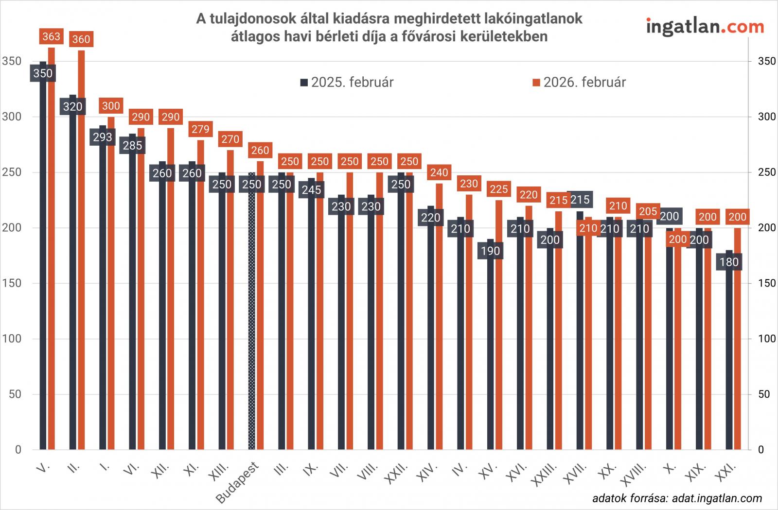 az V. és a II. kerület továbbra is kiemelkedik mezőnyből a 362,5 ezer és 360 ezer forintos mediánnal,