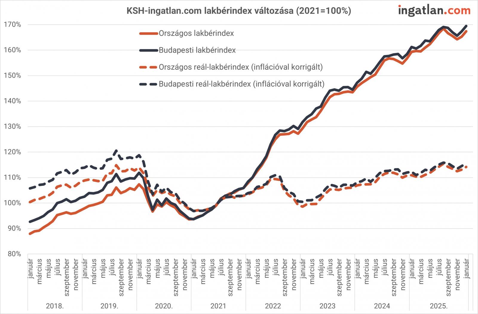A korábbi években megszokott tempós drágulás helyett visszafogottan nyitotta az évet az albérletpiac, januárban országosan és Budapesten havi összevetésben egyaránt 1,3 százalékkal nőttek a bérleti díjak – derül ki a KSH–ingatlan.com lakbérindex legfrissebb adataiból.