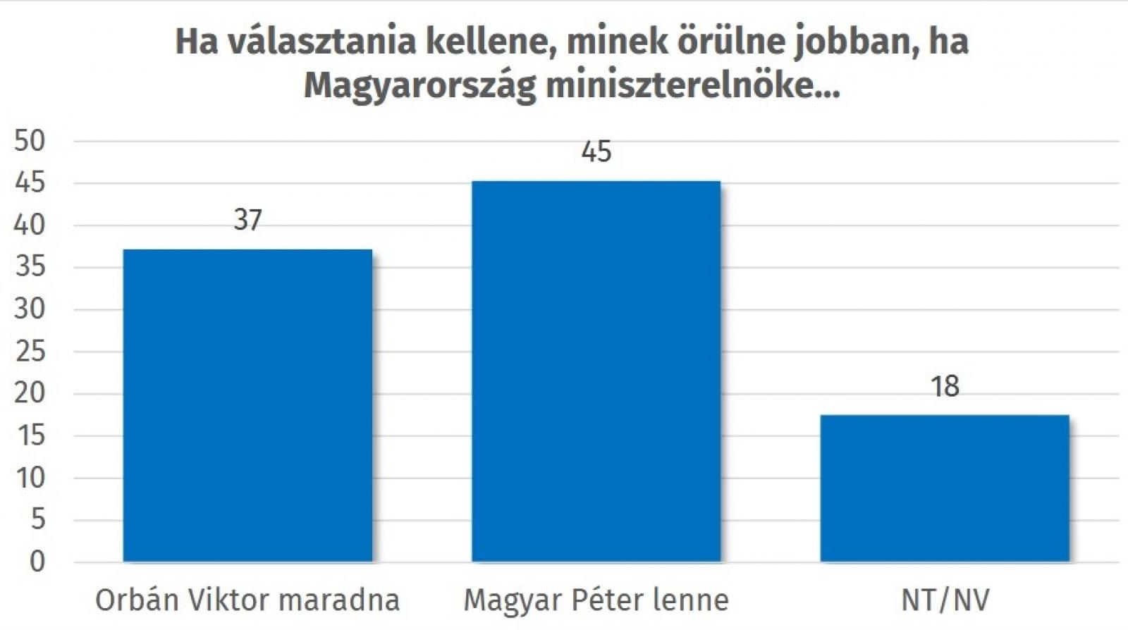 A válaszadók 45 százaléka Magyar Pétert szeretné látni a miniszterelnöki székben, míg 37 százalék továbbra is Orbán Viktort preferálja. 18 százalék nem tudott választani kettejük közül – derül ki a Republikon Intézet február 12. és 17. között végzett, lapunkhoz is eljuttatott kutatásából.