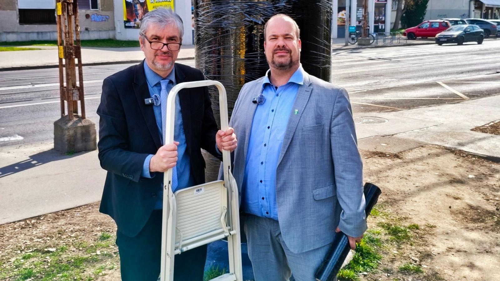 Lefóliázott Budapest XIV. kerületének momentumos polgármestere egy olyan hirdetőoszlopot, amelyen a kormányzat hirdetése látható.
