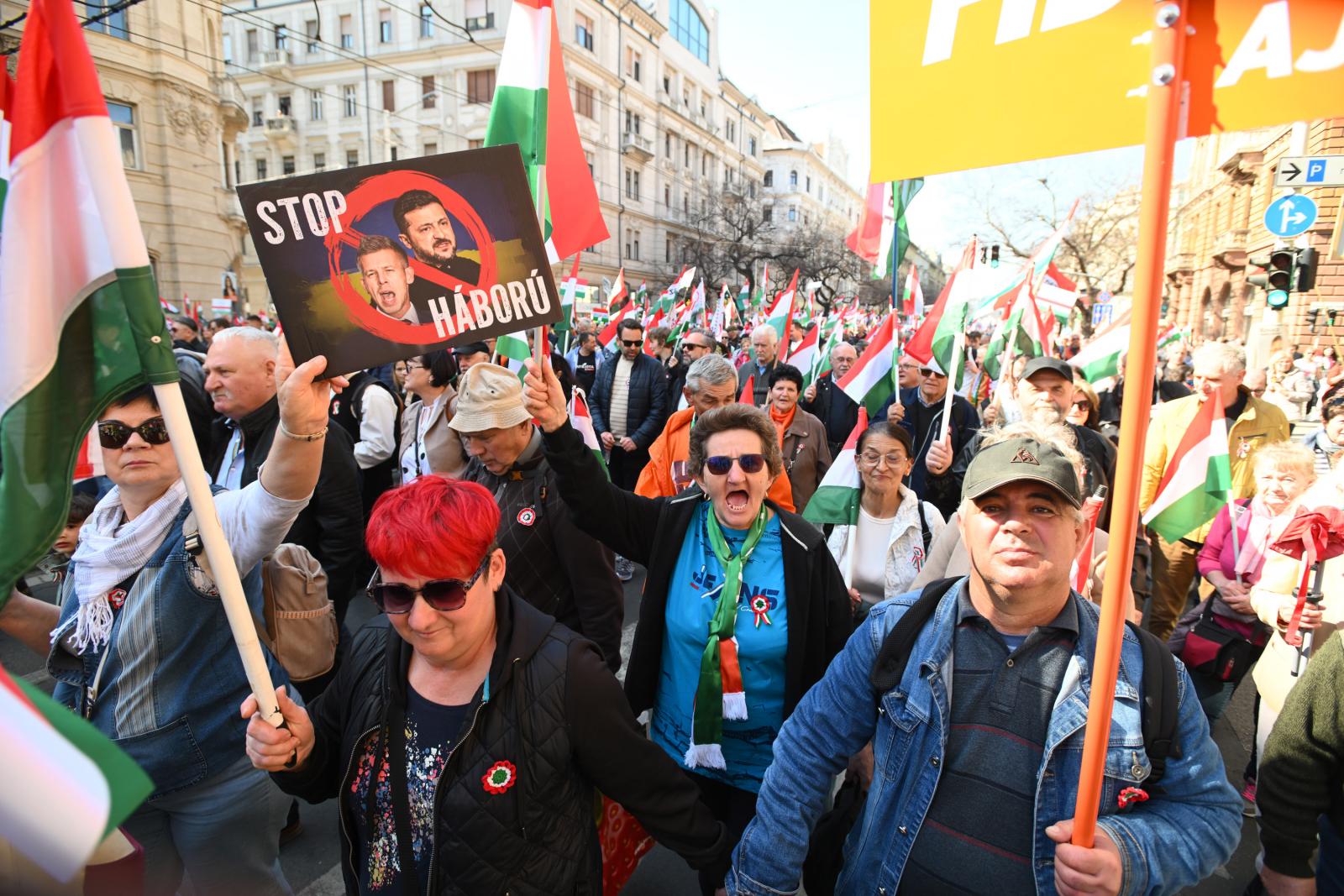 A tömeg – jó néhány tízezren lehettek – vidámnak és lelkesnek tűnt. A szervezők többféle táblát osztogattak. Az egyik azt hirdette, hogy „Zelenszkij rabjai nem leszünk!”, a másik azt, hogy „A Fidesz a biztos választás”. A harmadikon Magyar Péter és Volodimir Zelenszkij áthúzott fényképe mellett az állt, hogy „Stop háború!”, a negyediken szintén áthúzva cirill betűkkel és ukrán nemzeti színekkel szerepelt a Tisza.