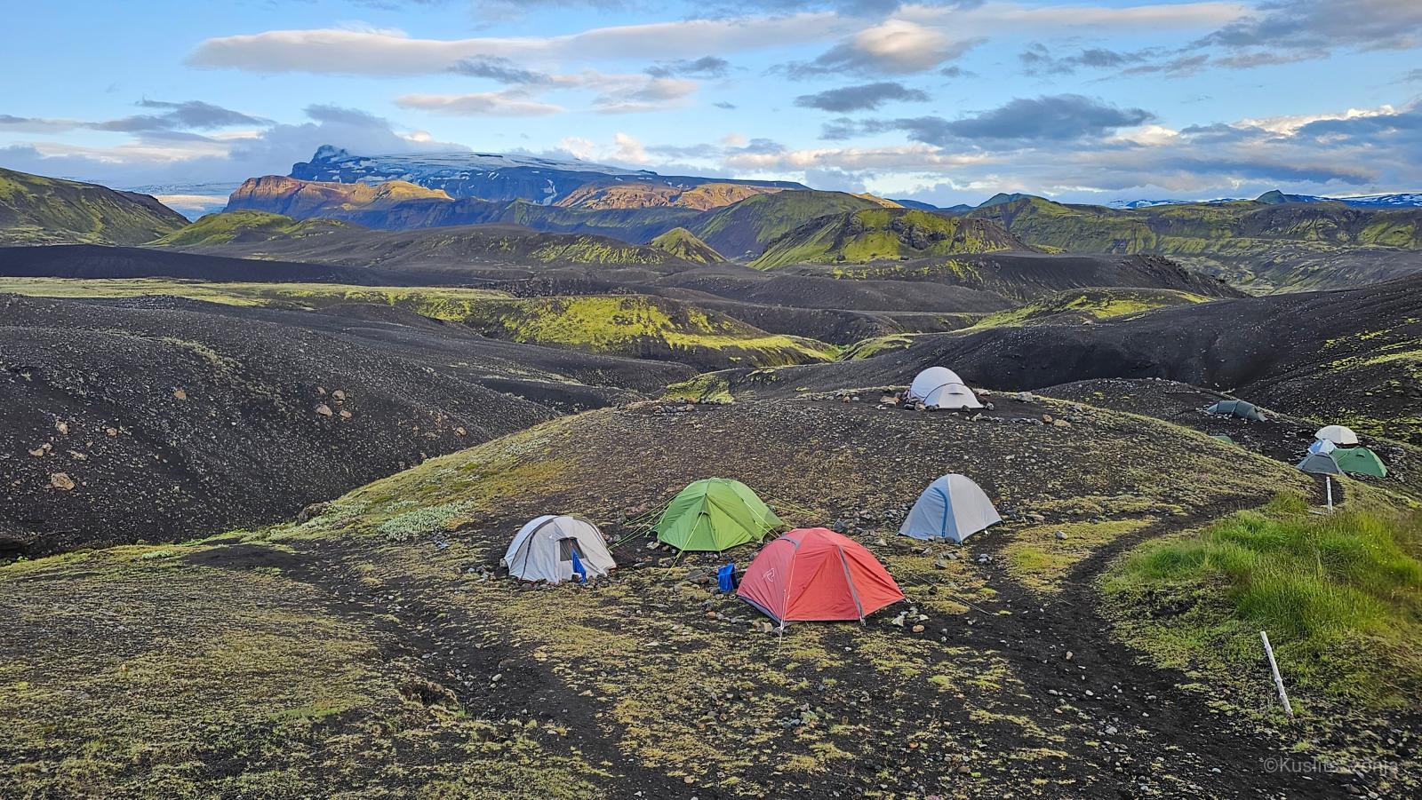 A túra első néhány órája a döbbeneté, nehéz felfogni azt a fajta vad szépséget, hatalmas hegyeket, nyílt teret, amely hirtelen körbevesz minket. Minden 10 percben meg kell állni egy fotó miatt, így viszonylag hosszú időbe telik, mire elérünk az első 12 km végére. Az obszidiánban gazdag, vulkanikus hegy tetején lévő Hrafntinnusker menedékhelyre. A túra egyik szépsége, hogy a táj folyamatosan változik, a színes hegyektől indulva a nap végére már csak havat és fekete vulkanikus kőzetet látunk. A talaj olyan kemény, hogy a sátrat nem lehet a hagyományos módon rögzíteni, hatalmas kövekkel kell körberakni, hogy ne vigye el a szél. Estére a fekete talajt kiszínezik a sárga, piros, neonzöld sátrak és egyre nehezebb helyet és köveket találni. Minden évben 75-100 ezer ember pihen meg a világnak ezen távoli, térerő nélküli szegletében. Ennyien döntenek úgy, a tengerpart helyett nekik inkább ez a kihívás kell. Nem egy magas szám, főleg, ha figyelembe vesszük, hogy évente 1,5-2 millióan nyaralnak a Balatonnál.