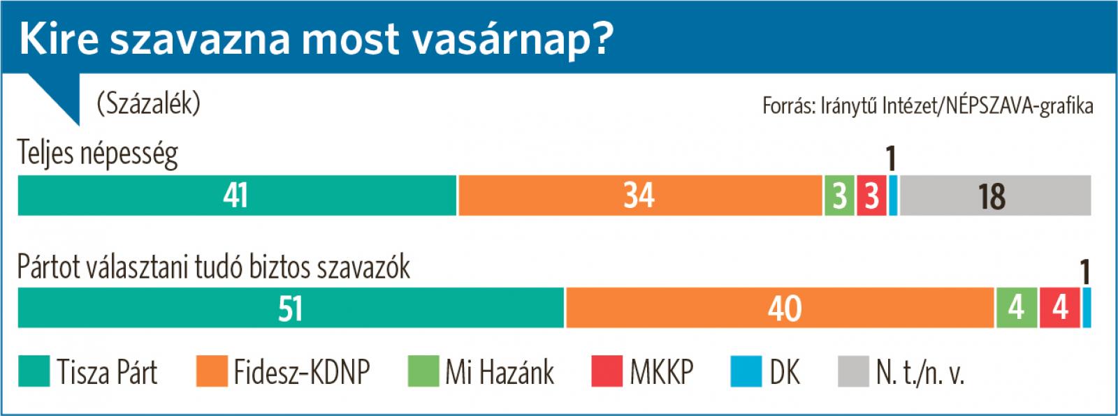 A reprezentatív kutatás alapján a teljes népesség 41 százaléka a Tiszát, 34 százaléka a kormánypártokat támogatja. E körben a Mi Hazánk és a Magyar Kétfarkú Kutya Párt is 3-3 százalékon áll.
