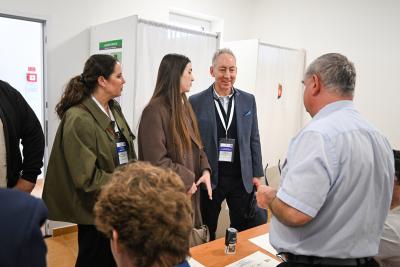 Az átjelentkezők a tornateremben szavaznak, ahol tíz asztalt sorakoztattak fel. Erről már a folyosón tábla informálja a szavazókat, de akad ott is egyenruhás közterület-felügyelő. A XIII. kerület komolyan vette a szervezést, a külső asztalokon vizes palackok a szomjazóknak, a mosdóban még kéztörlő papír is van.