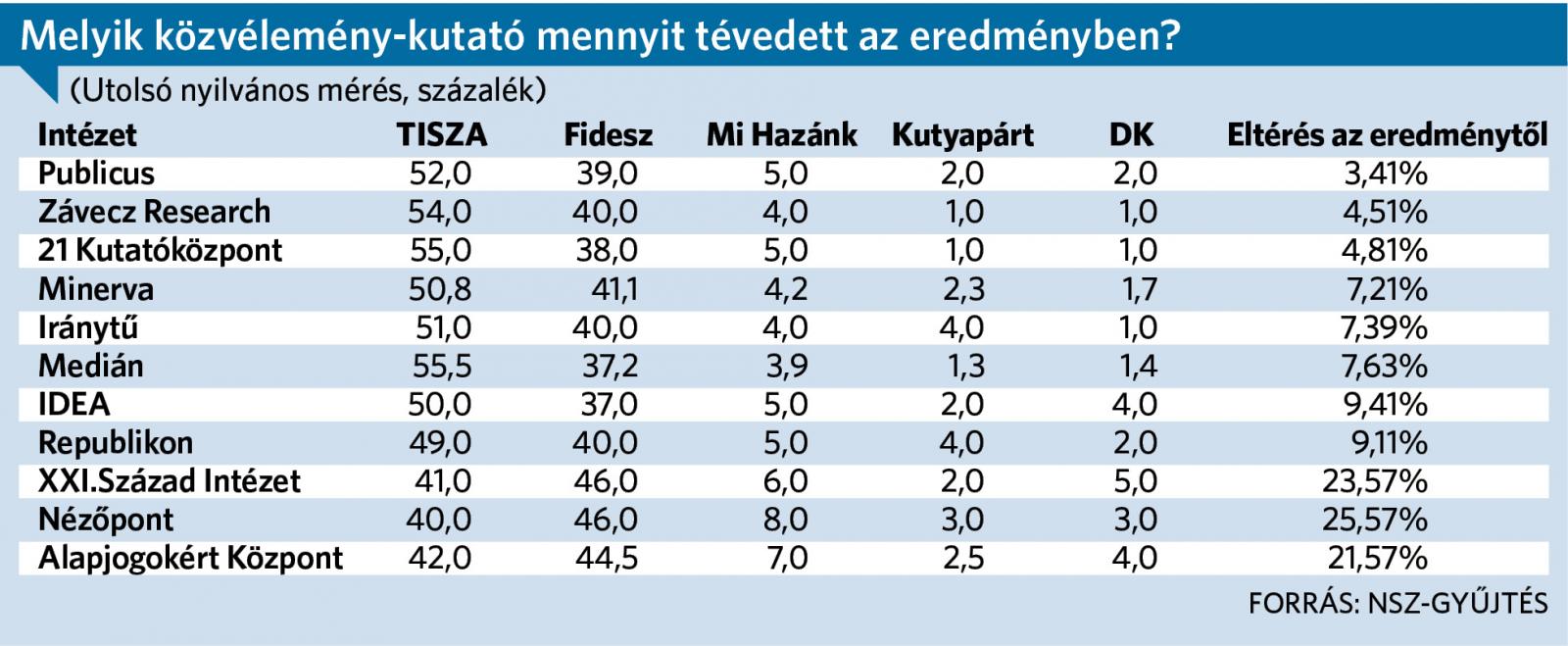 A Tiszát, a Fideszt, a Mi Hazánkot és a kisebb pártokat figyelembe véve a Nézőpont 25,57 százalékkal tévedett. (A statisztikai hibahatár általában 3 és 5 százalék között van.) A Schmidt Mária fémjelezte XXI. Század Intézet most ebben a kampányban kezdett közvélemény-kutatással foglalkozni, így az ő 23,57 százalékos fiaskójuk talán a rutintalansággal magyarázható. A kormánypárti kutatók közül viszont az Alapjogokért Központ „tévedett” a legkisebbet, „csak” 21,5 százalékot.