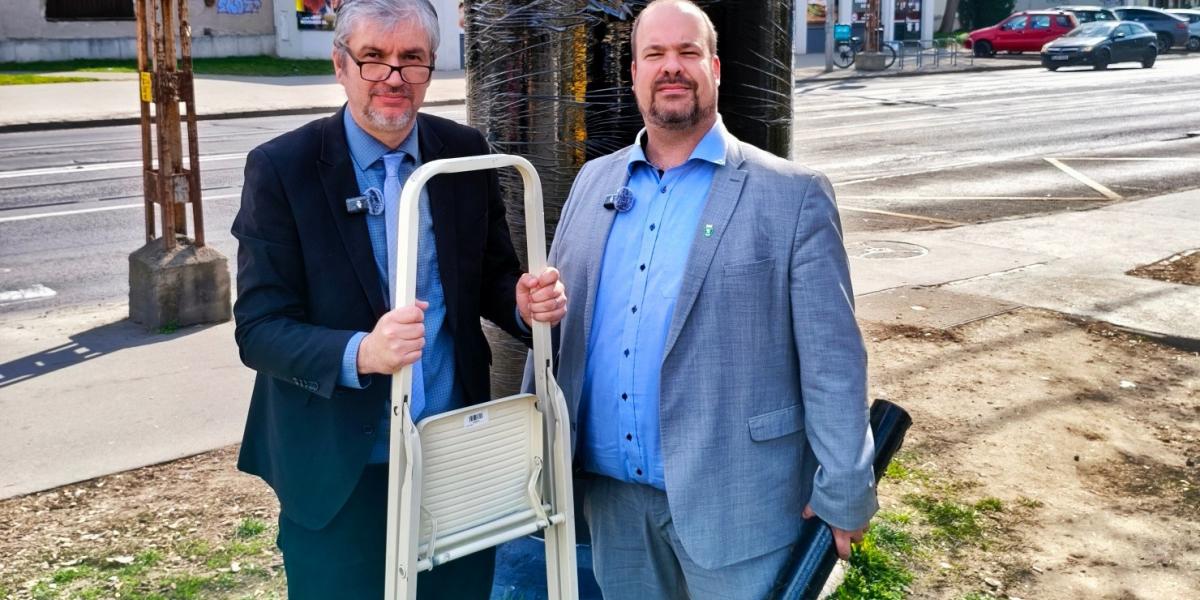 Videón, ahogy Hadházy Ákos és a zuglói polgármester lefóliáz egy hirdetőoszlopot