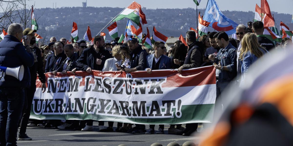 Fidelitasos kötődésű személyek feszítették ki az ukrán zászlót a Tisza Párt Nemzeti Menetén