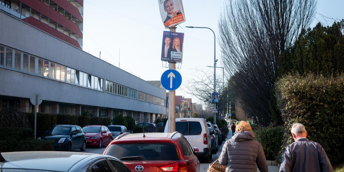 Illusztráció: Tisza-szimpatizánsok várakoznak egy Fidesz-plakát mellett március 15-én